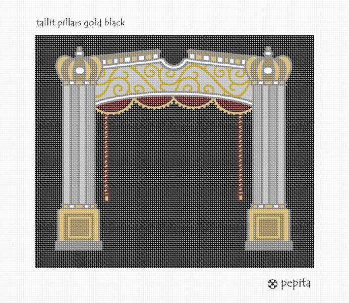 This is a classic design found on many tallit bags. Pillars, an arch, drapes, and a pair of bell pulls, all stitched in silver thread against a deep navy blue background. The name is in the center.