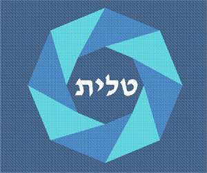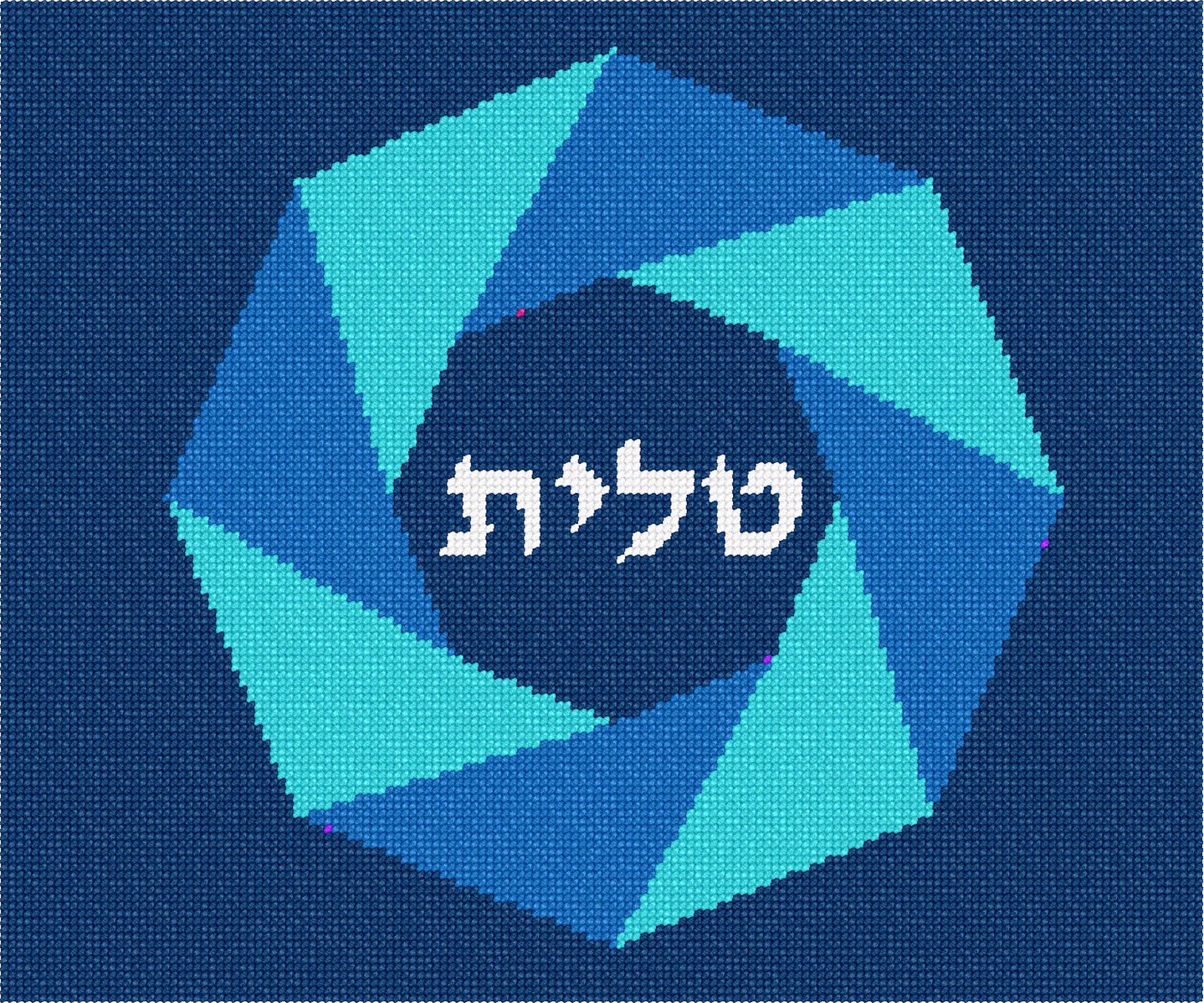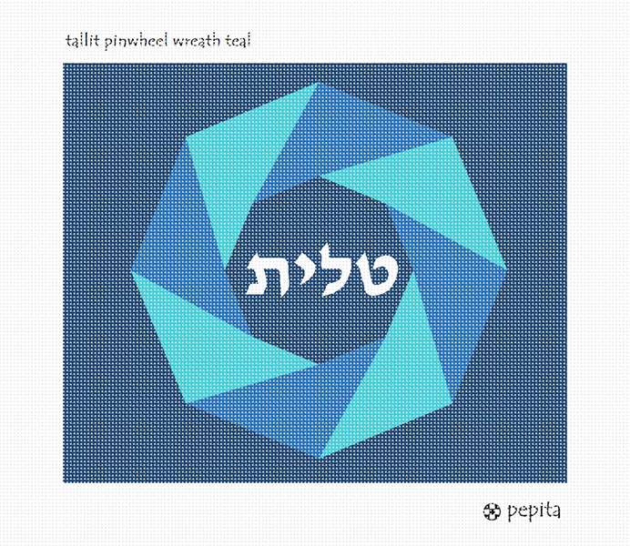 A tallit bag with a wreath in shades of teal. This is a modern, neat design. You stitch the front. After it is completely stitched, it is sent to a professional finisher who adds a lining, back, and matching zipper.