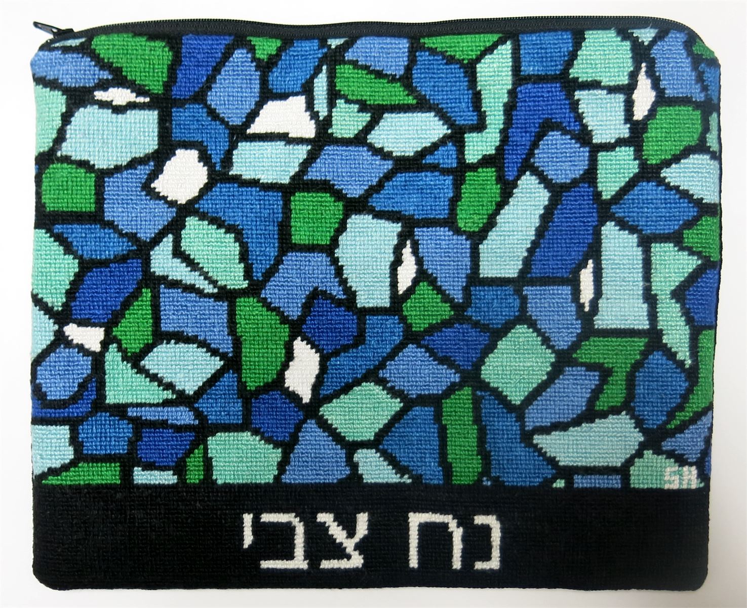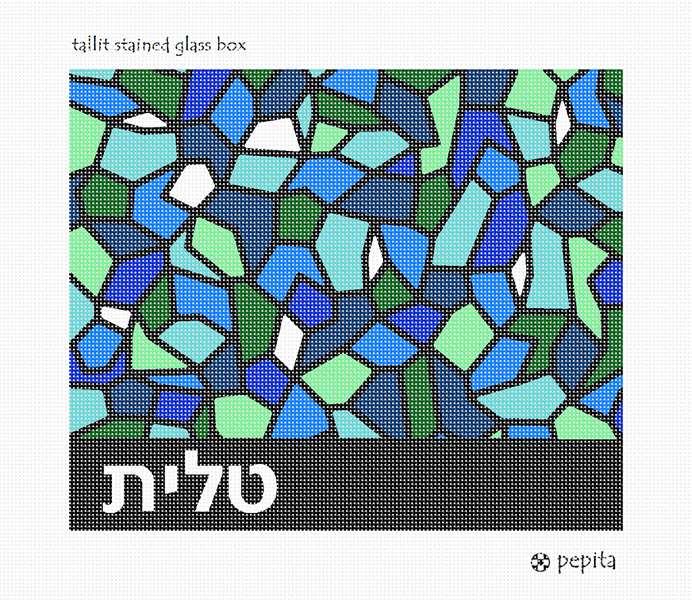 Tallit Stained Glass in vivid colors. Stained glass design is very popular on many Judaica items. You stitch the front. After it is completely stitched, it is sent to a professional finisher who adds a lining, back, and matching zipper.
