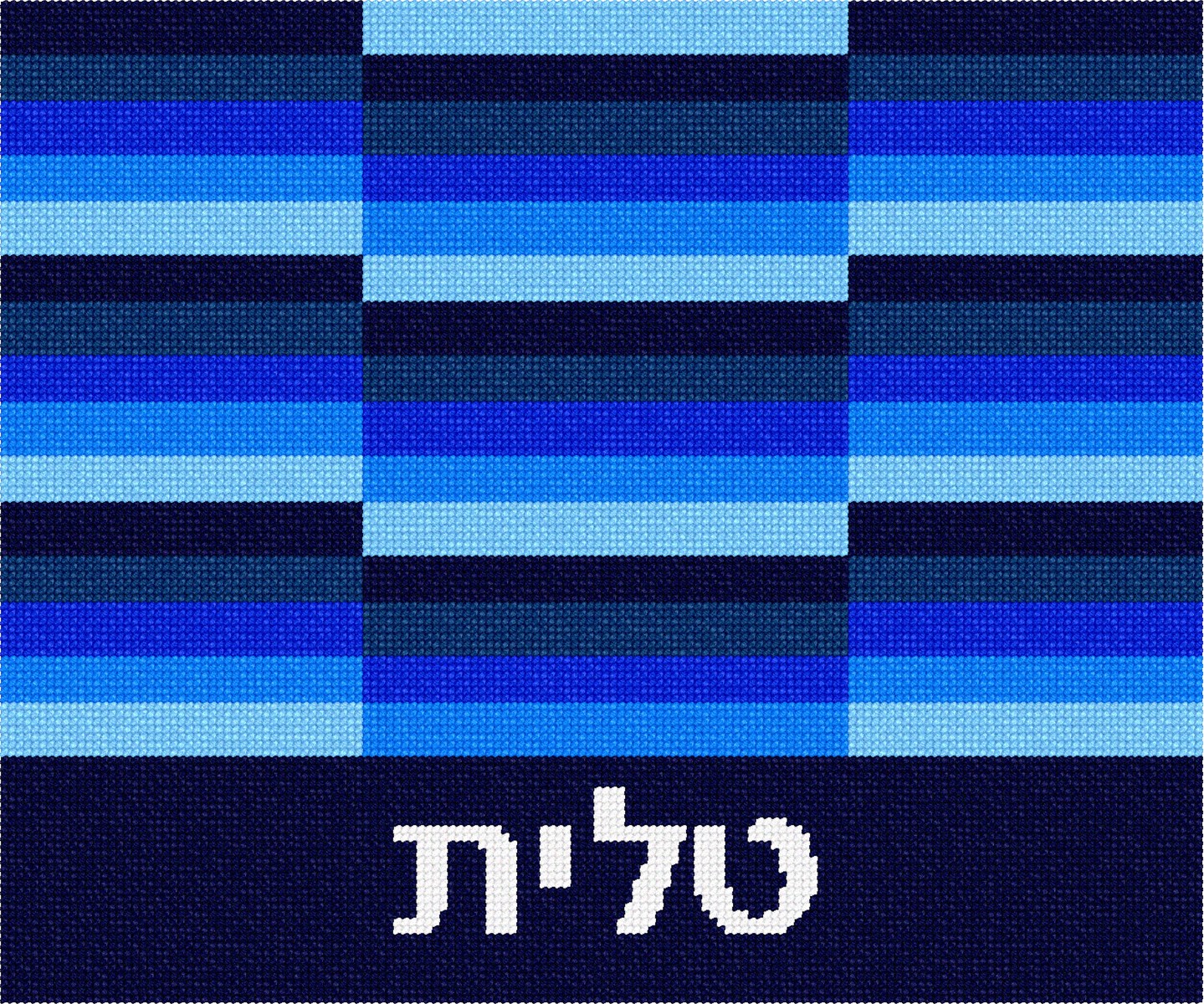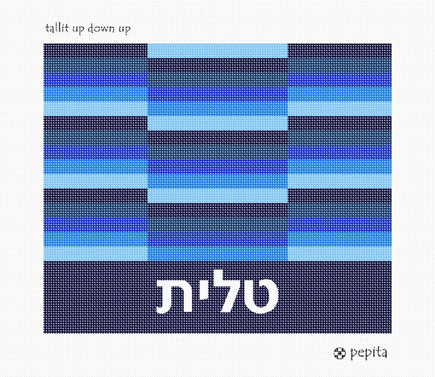 Sharp geometric tallit bag design. Geometrics are very vogue in tallit and tefillin bags today. You stitch the front. After it is completely stitched, it is sent to a professional finisher who adds a lining, back, and matching zipper.