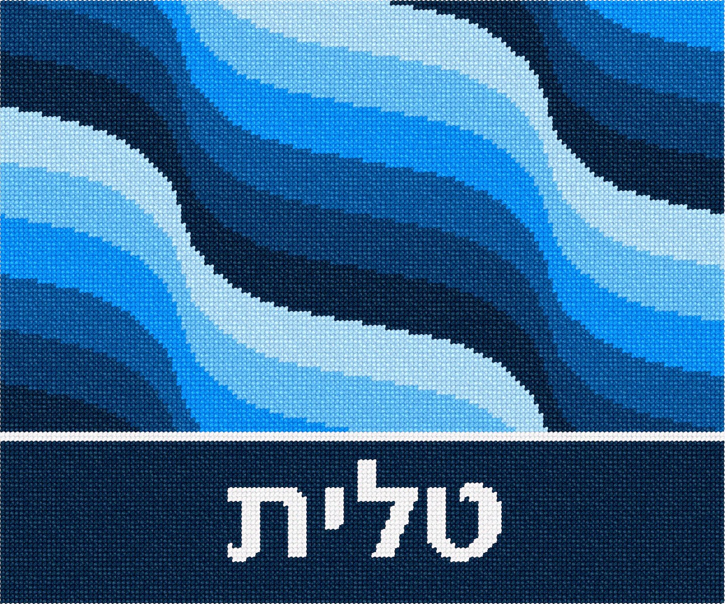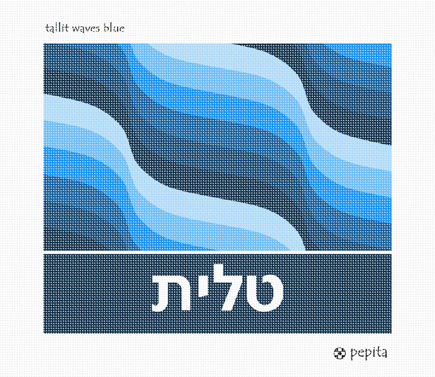 Tallit bag wave pattern in shades of blue. You stitch the front. After it is completely stitched, it is sent to a professional finisher who adds a lining, back, and matching zipper. See coordinating siddur cover.