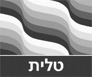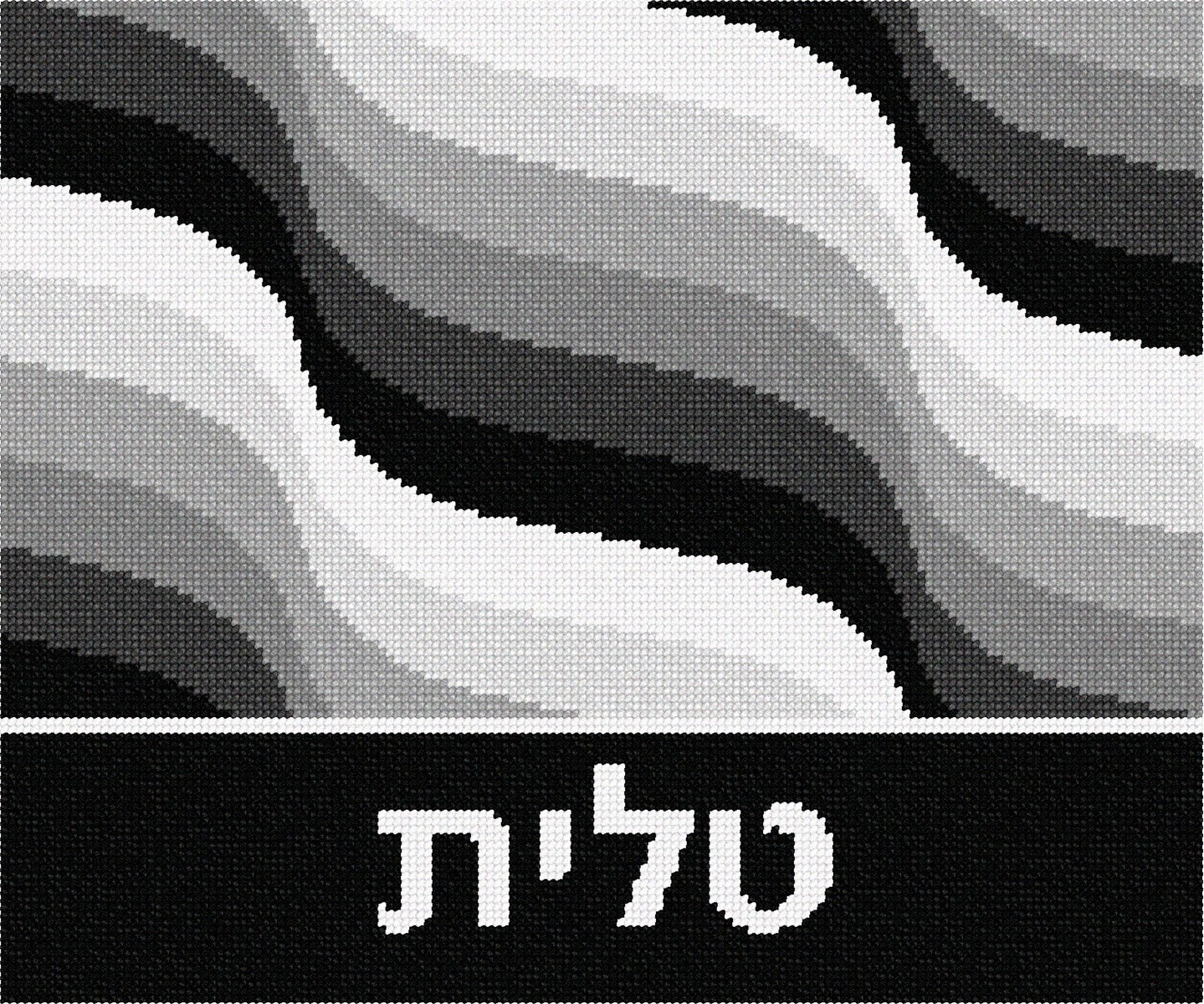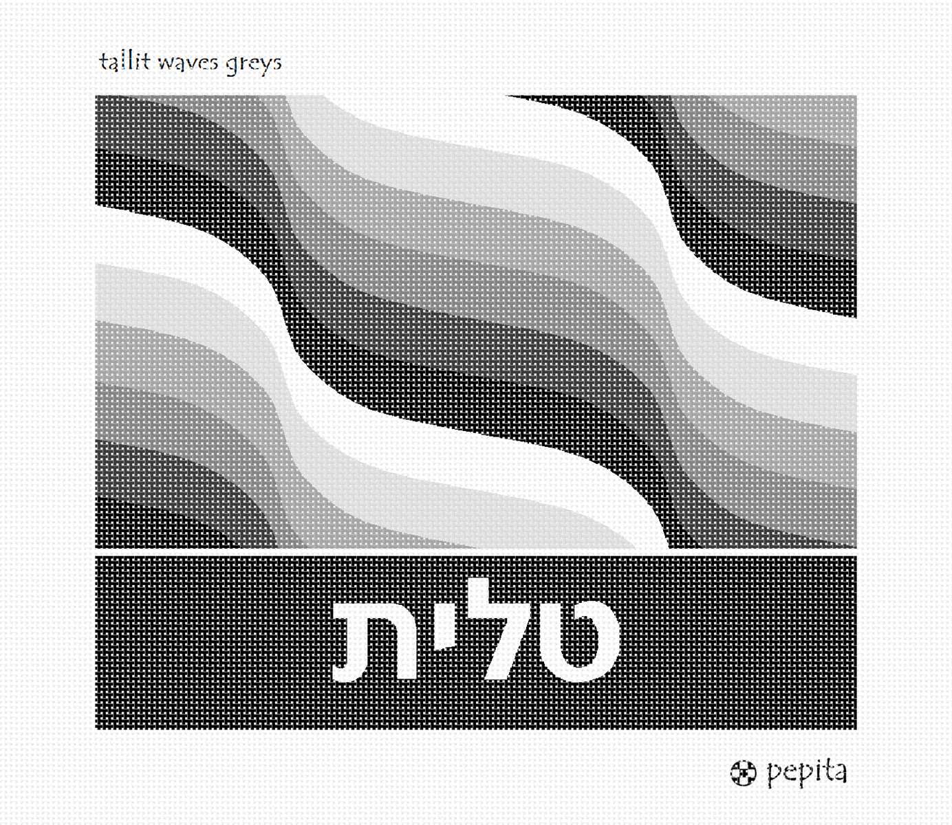 Tallit bag design with wavy gray lines dominating the upper portion, and a solid area for text along the bottom, separated by a white line. You stitch the front. After it is completely stitched, it is sent to a professional finisher who adds a lining, back, and matching zipper. See coordinating siddur cover.