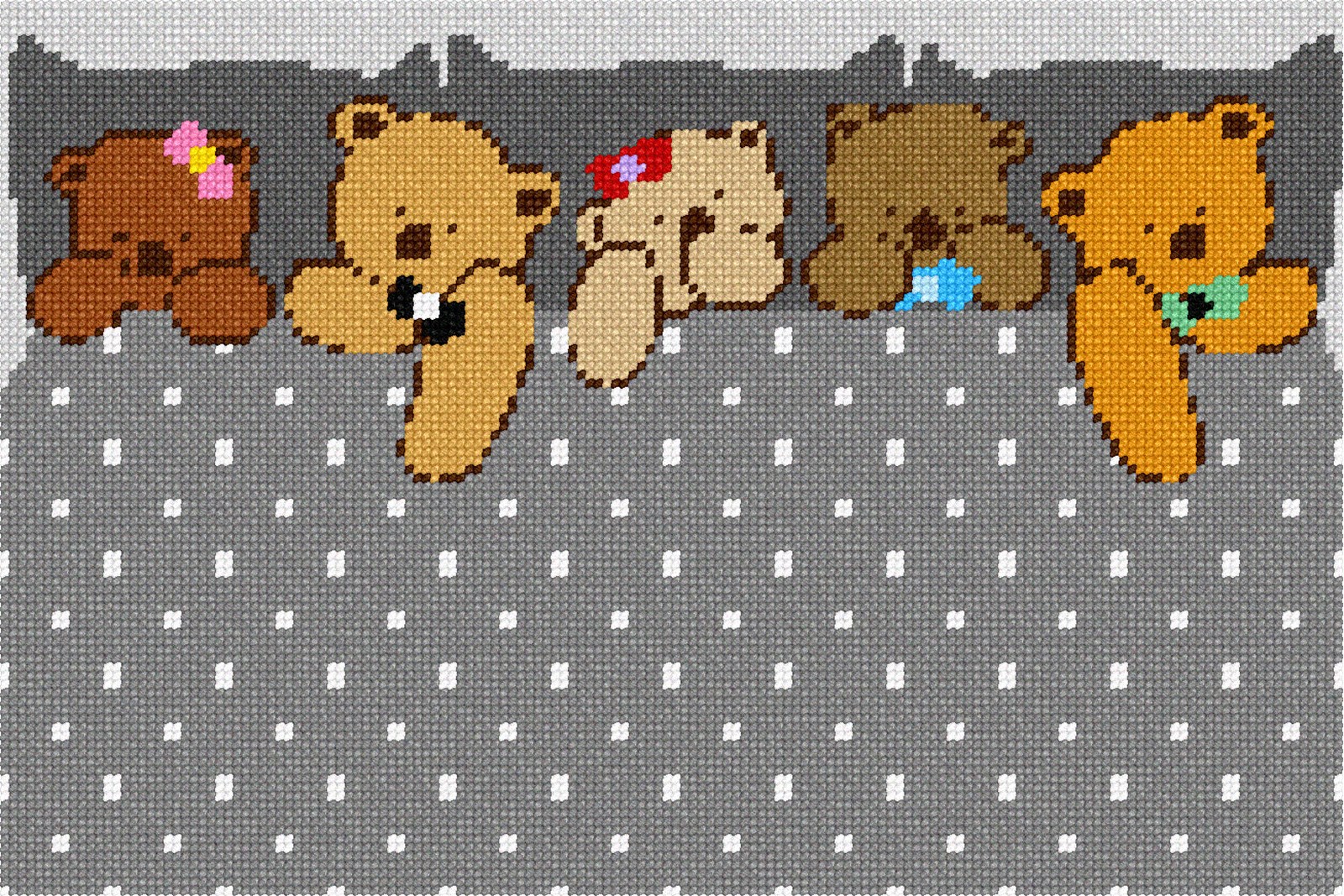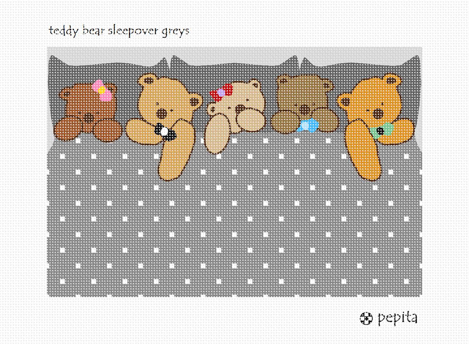 The teddies are having a sleepover! This adorable needlepoint is sure to capture the hearts of young and old. Five bears with bows are decked under the duvet. This is available in blue and wine color combinations too.