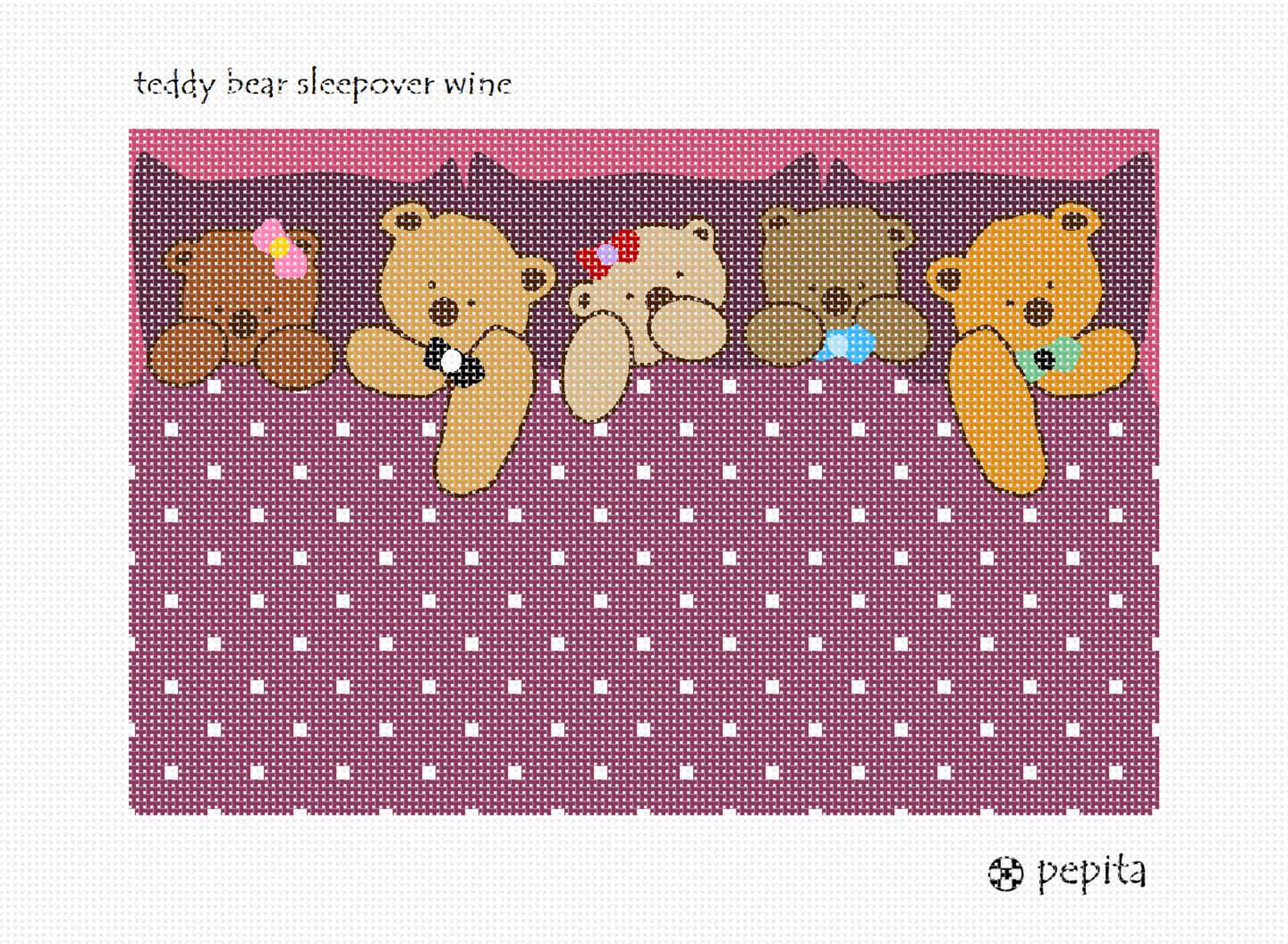 The teddies are having a sleepover! This adorable needlepoint is sure to capture the hearts of young and old. Five bears with bows are decked under the duvet. This is available in other blues and greys too.