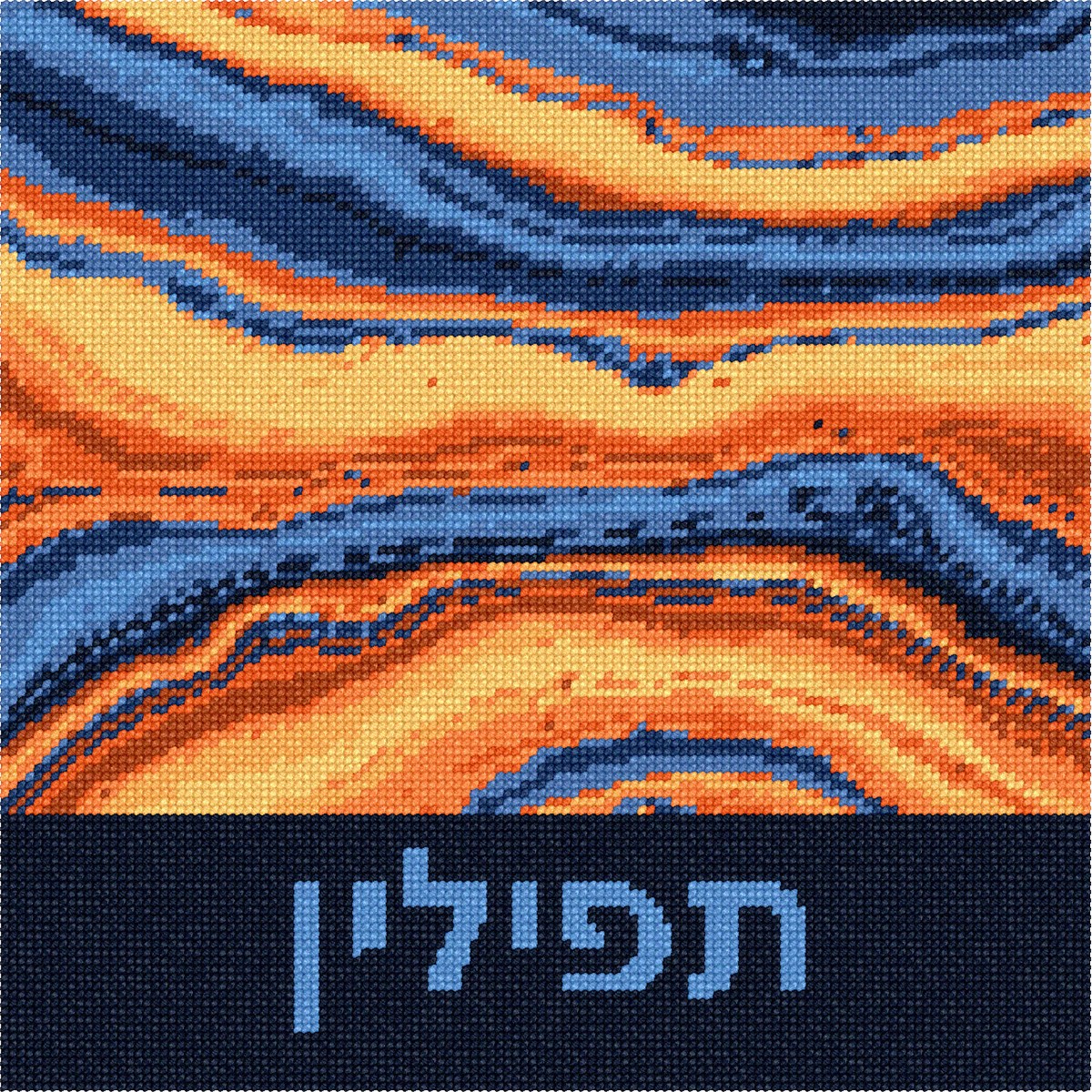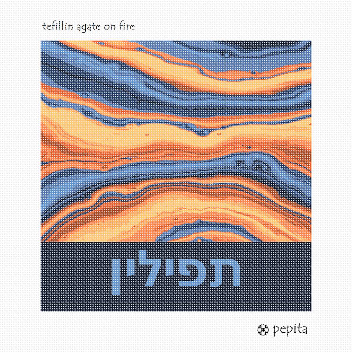 The colors of a freshly lit fire in a tefillin bag design. Coordinating tallit bag needlepoint is available.