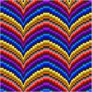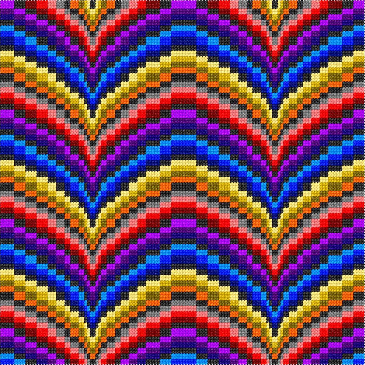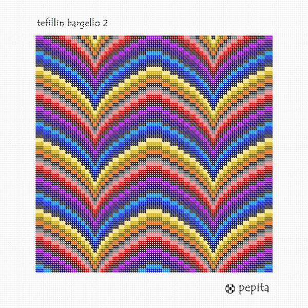 Simple but elegant bargello pattern in an array of colors. See matching tallit bag. Geometrics are very vogue in tallit and tefillin bags today. You stitch the front. After it is completely stitched, it is sent to a professional finisher who adds a lining, back, and matching zipper. Mazel Tov on the Bar Mitzvah! Bargello is a type of needlepoint embroidery consisting of upright flat stitches laid in a mathematical pattern to create motifs. The name originates from a series of chairs found in the Bargello palace in Florence, which have a "flame stitch" pattern. Traditionally, Bargello was stitched in wool on canvas. Embroidery done this way is remarkably durable. It is well suited for use on pillows, upholstery and even carpets, but not for clothing. In most traditional pieces, all stitches are vertical with stitches going over two or more threads.