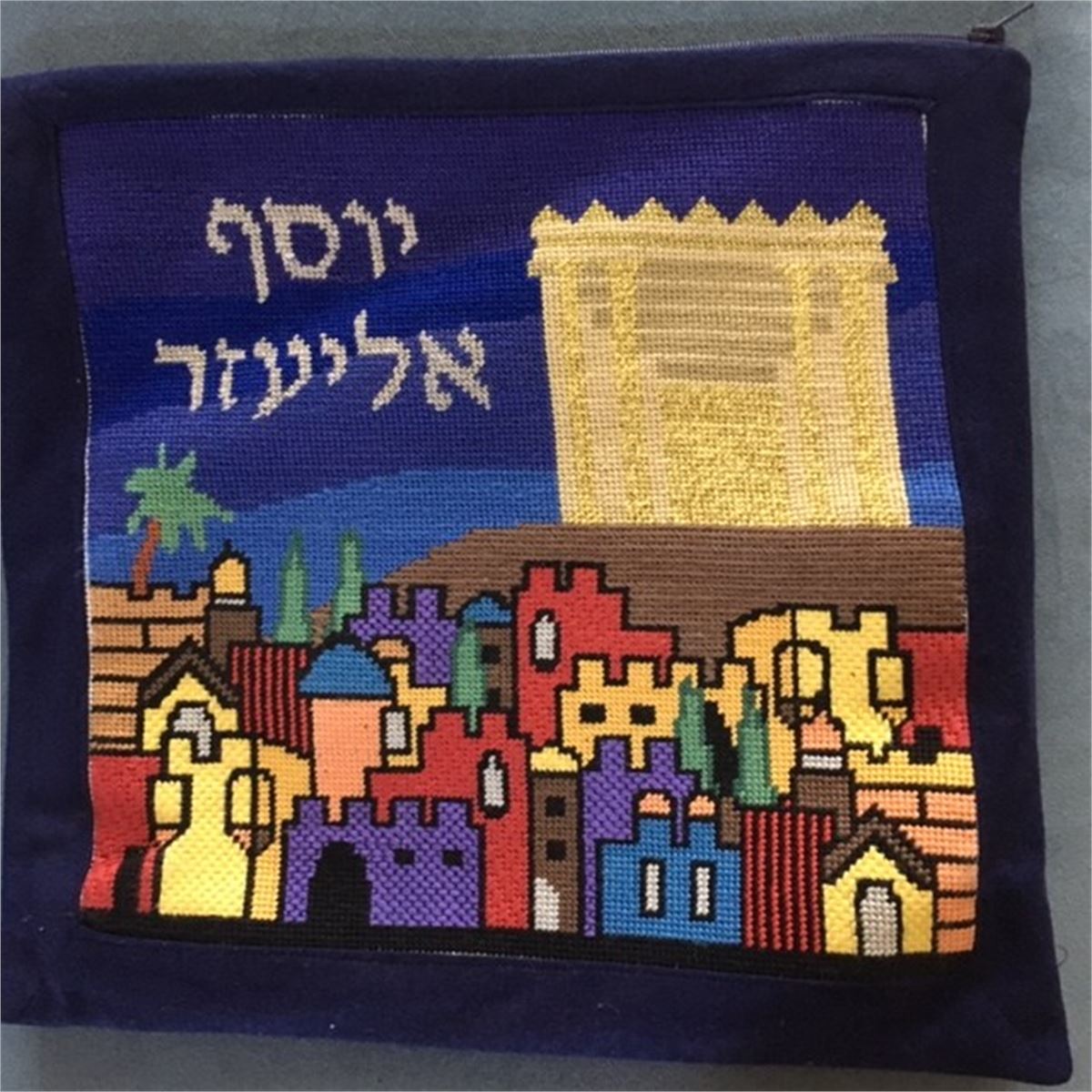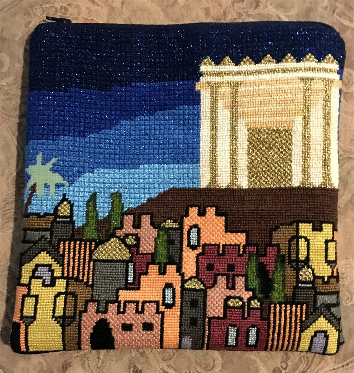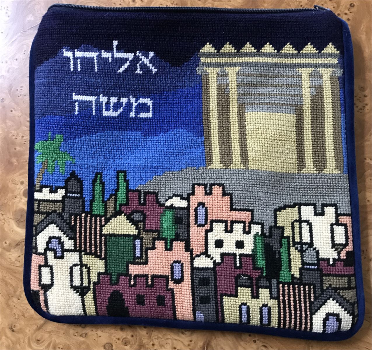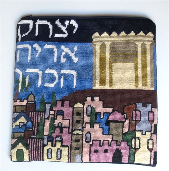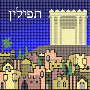 Two thousand years ago, the Holy Temple stood on the Temple Mount in Jerusalem. Jews the world over pray every day that it should be rebuilt. This tefillin bag design depicts the Holy Temple as it is described in the Talmud. Various structures and trees surround it along the mountainside.