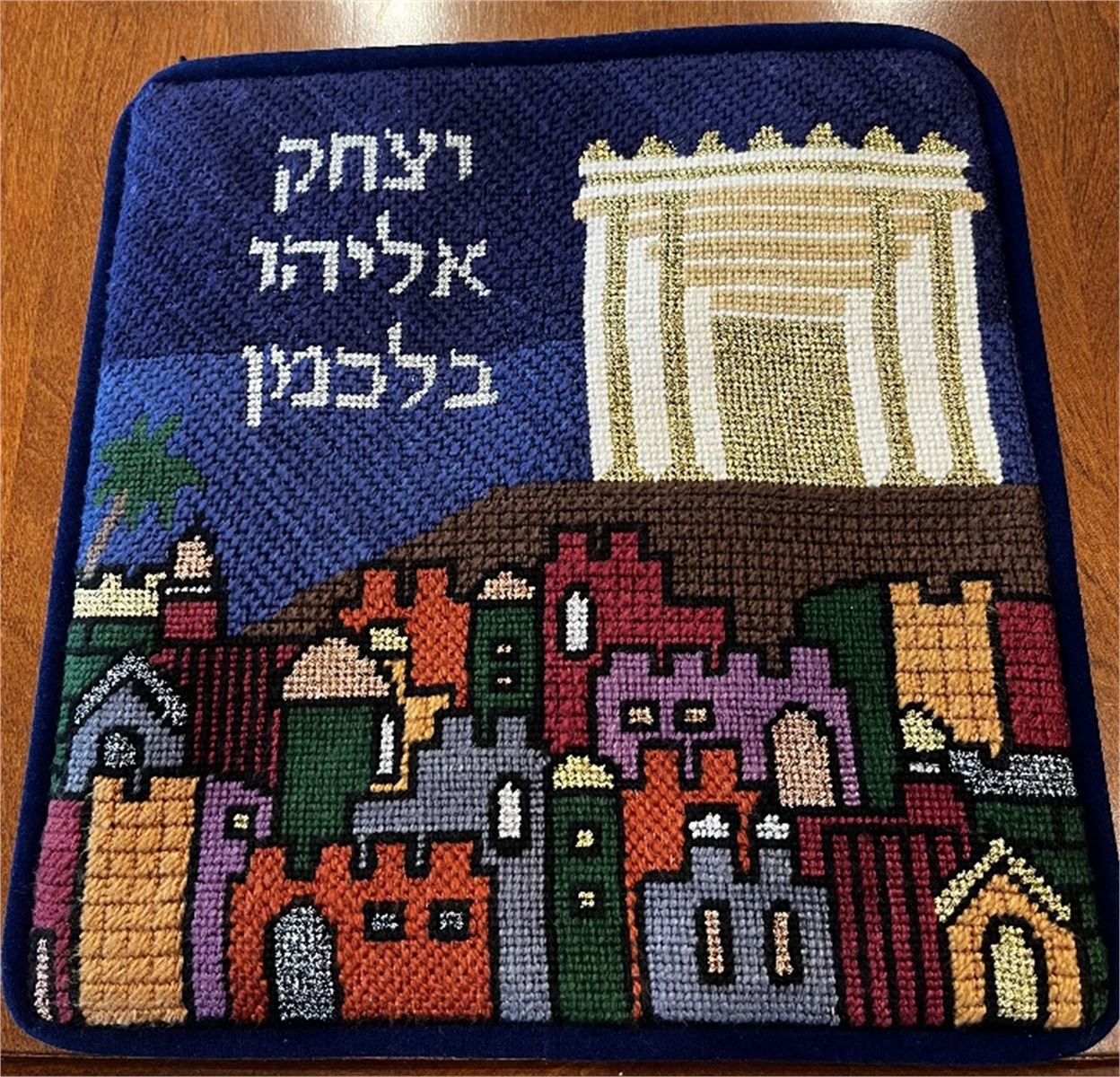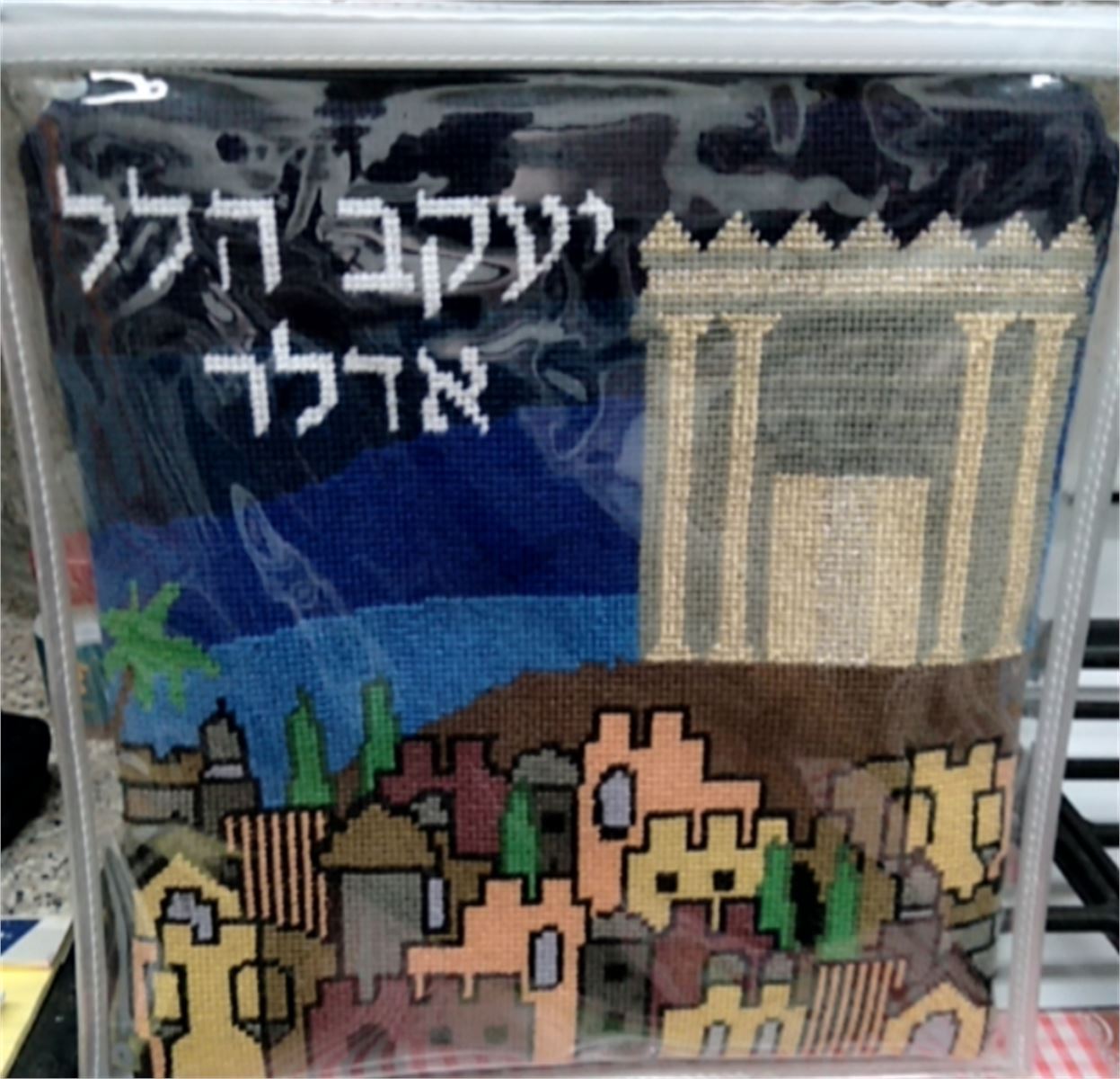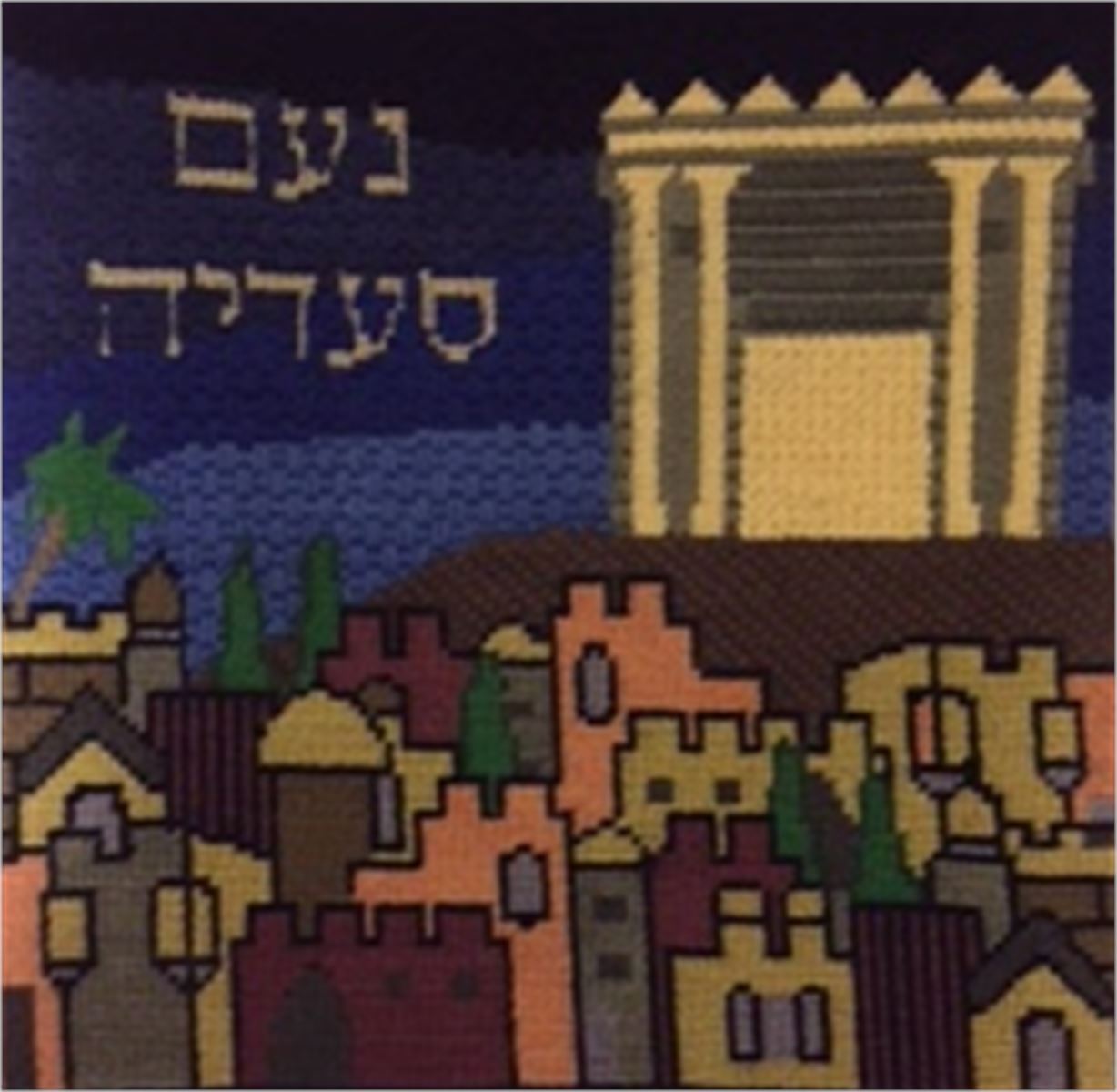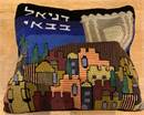 Two thousand years ago, the Holy Temple stood on the Temple Mount in Jerusalem. Jews the world over pray every day that it should be rebuilt. This tefillin bag design depicts the Holy Temple as it is described in the Talmud. Various structures and trees surround it along the mountainside.