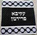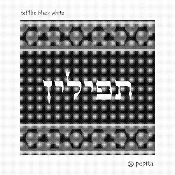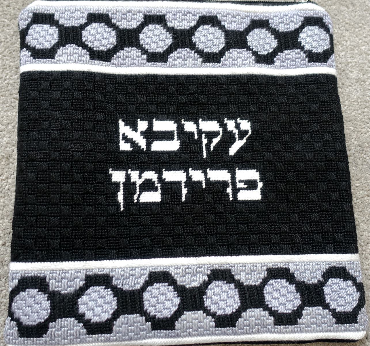 A tefillin bag with grey chain borders. Tefillin are gifted to a Jewish boy upon his bar mitzvah when he turns thirteen. He is taught how to perfom this holy Mitzvah properly before his birthday.