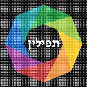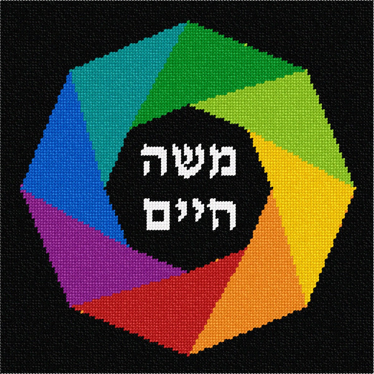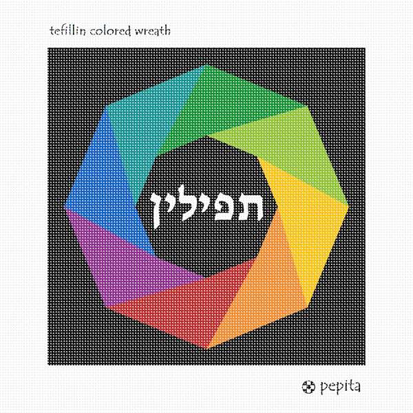 A colorful tefillin bag design with a wreath in the center. See matching tallit bag. Geometrics are very vogue in tallit and tefillin bags today. You stitch the front. After it is completely stitched, it is sent to a professional finisher who adds a lining, back, and matching zipper.