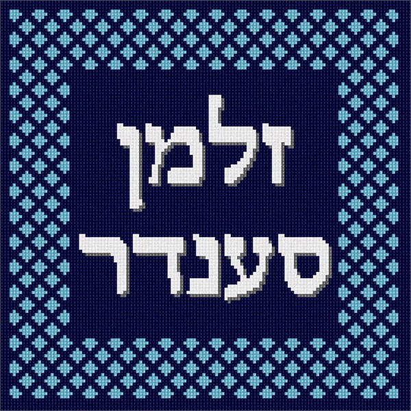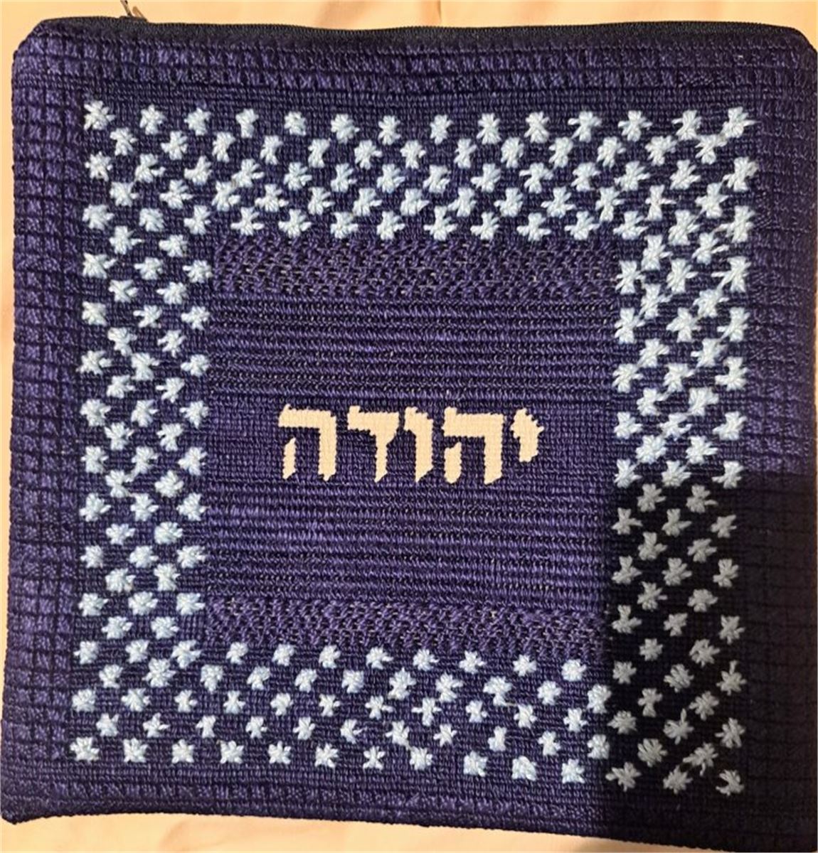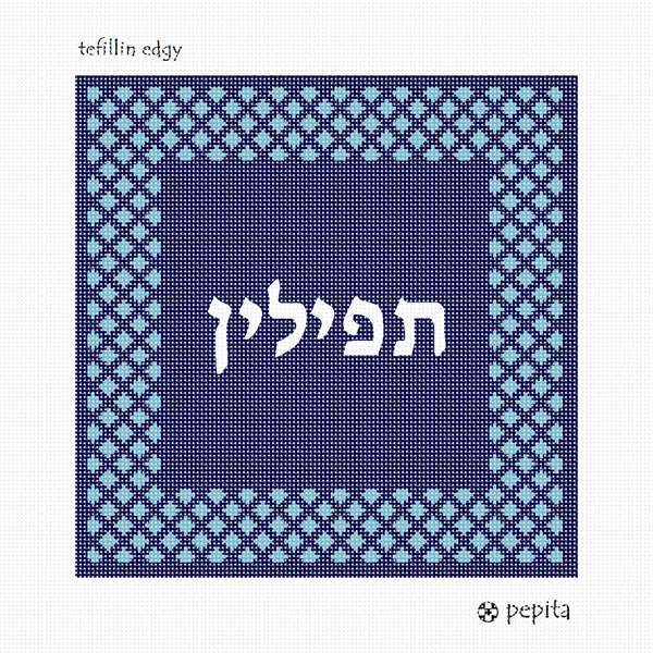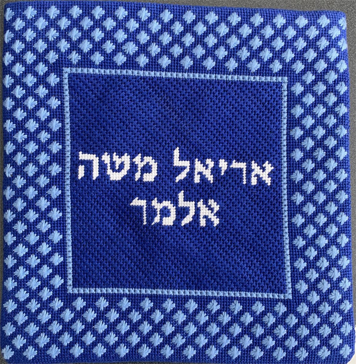 Design with a frame made of edgy criss-crosses. See matching tallit bag. Geometrics are very vogue in tallit and tefillin bags today. You stitch the front. After it is completely stitched, it is sent to a professional finisher who adds a lining, back, and matching zipper.