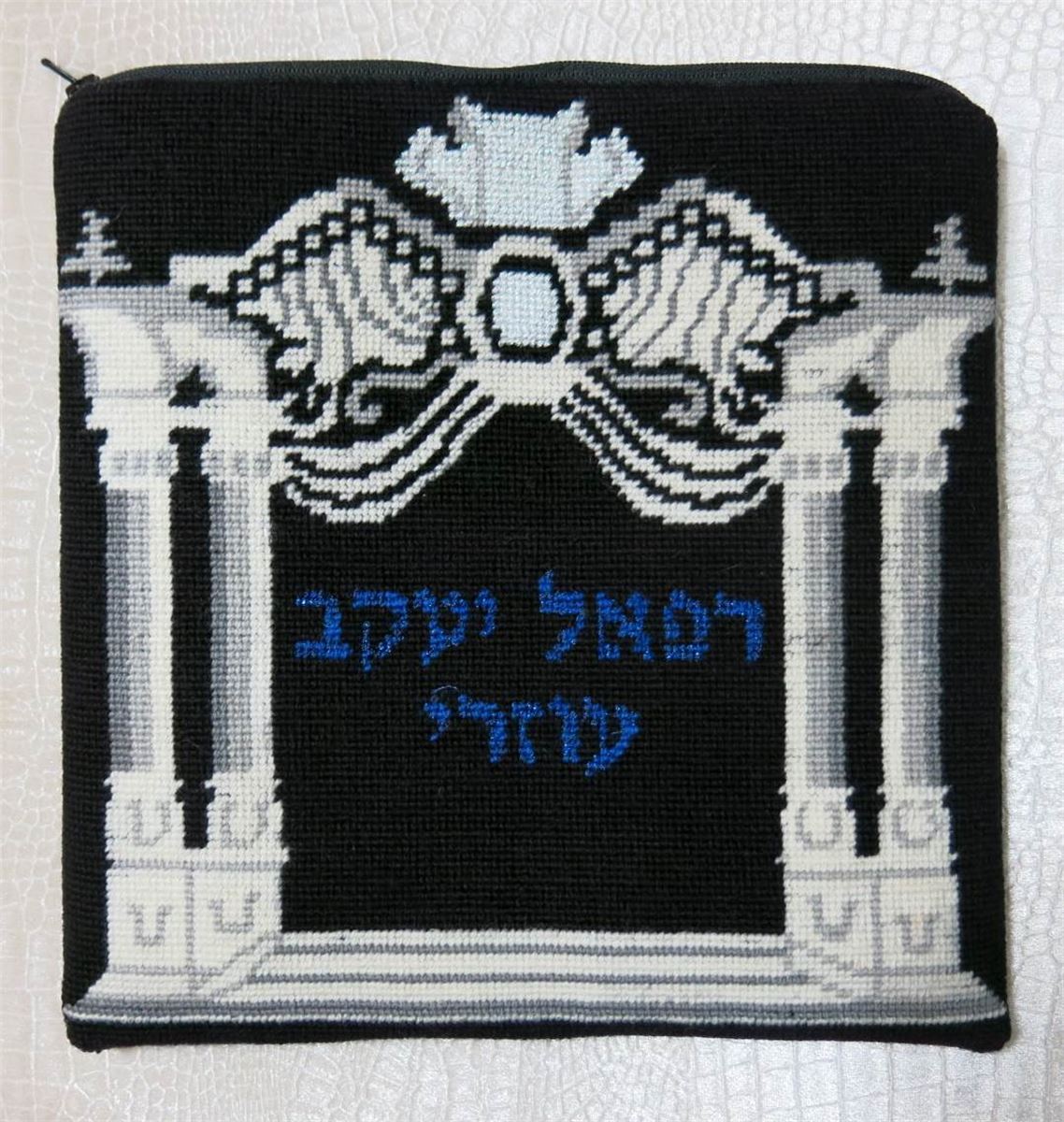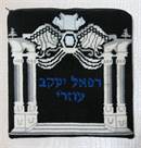 This special design was first conceived in the 19th century and printed on the title page of the Vilno Talmud. For the first time, it has been adapted for needlepoint Tefillin bags. Four pillars support an arch with drapes, topped by a crown, on an etched floor. Shades of silver against navy blue. Space for custom text provided in the center area.