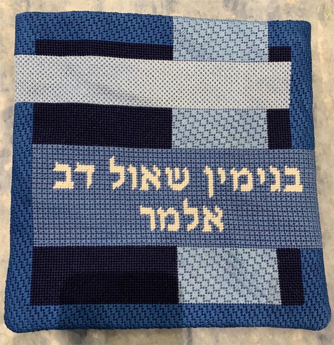 Tefillin bag made of blue rectangles. See matching tallit bag. Geometrics are very vogue in tallit and tefillin bags today. You stitch the front. After it is completely stitched, it is sent to a professional finisher who adds a lining, back, and matching zipper.