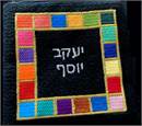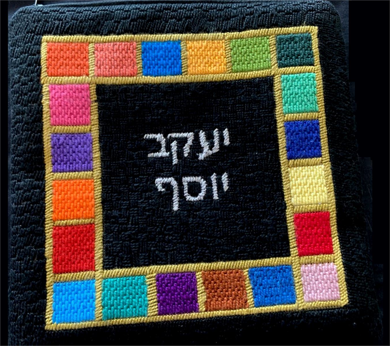 A border of game pieces. See matching tallit bag. Geometrics are very vogue in tallit and tefillin bags today. You stitch the front. After it is completely stitched, it is sent to a professional finisher who adds a lining, back, and matching zipper.