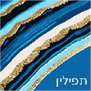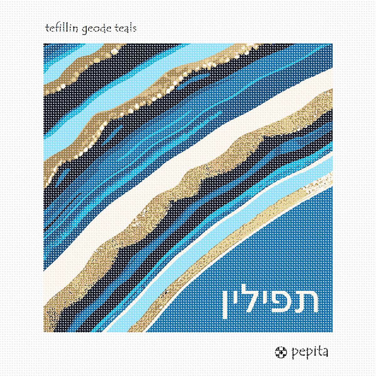A geode is a stone having a cavity lined with crystals or mineral matter. Most geodes contain clear quartz crystals. Geodes are found all over the world especially in desert regions.This summer I experimented with resin art to create geode looks on glass. That inspired me to design tefillin, tallit, and challah covers with geode characteristics. This one is a teal and gold variation.