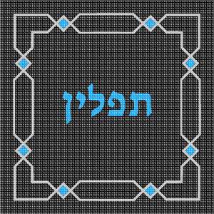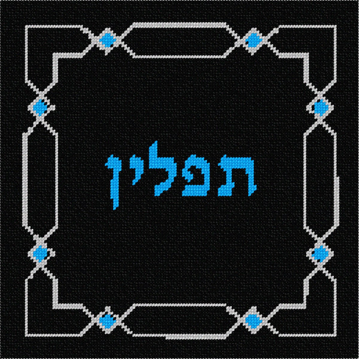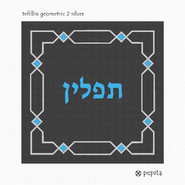 Geometric tefillin design with just the right amount of blue to make it sparkle. See matching tallit bag. Geometrics are very vogue in tallit and tefillin bags today. You stitch the front. After it is completely stitched, it is sent to a professional finisher who adds a lining, back, and matching zipper. Mazel Tov on the Bar Mitzvah!