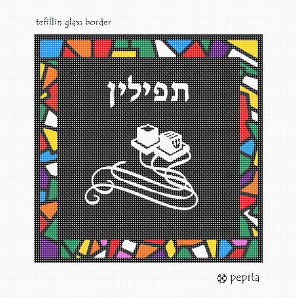If you like stained glass, this tefillin bag is for you. Stained glass design is very popular on many Judaica items. You stitch the front. After it is completely stitched, it is sent to a professional finisher who adds a lining, back, and matching zipper. And Mazel Tov on the Bar Mitzvah!
