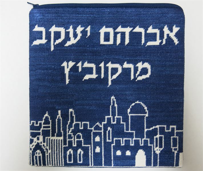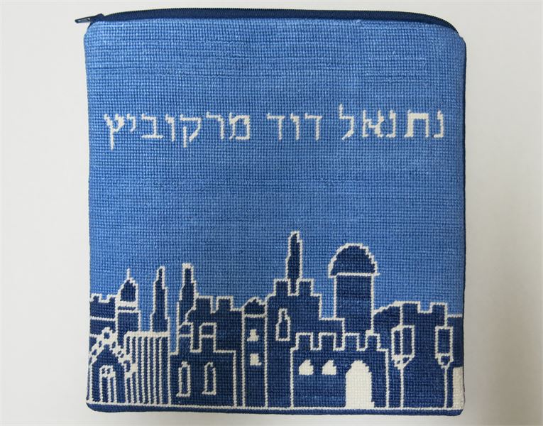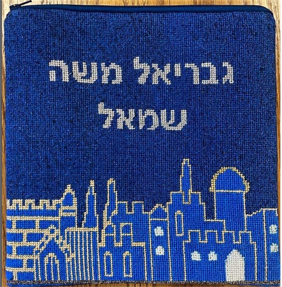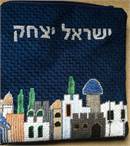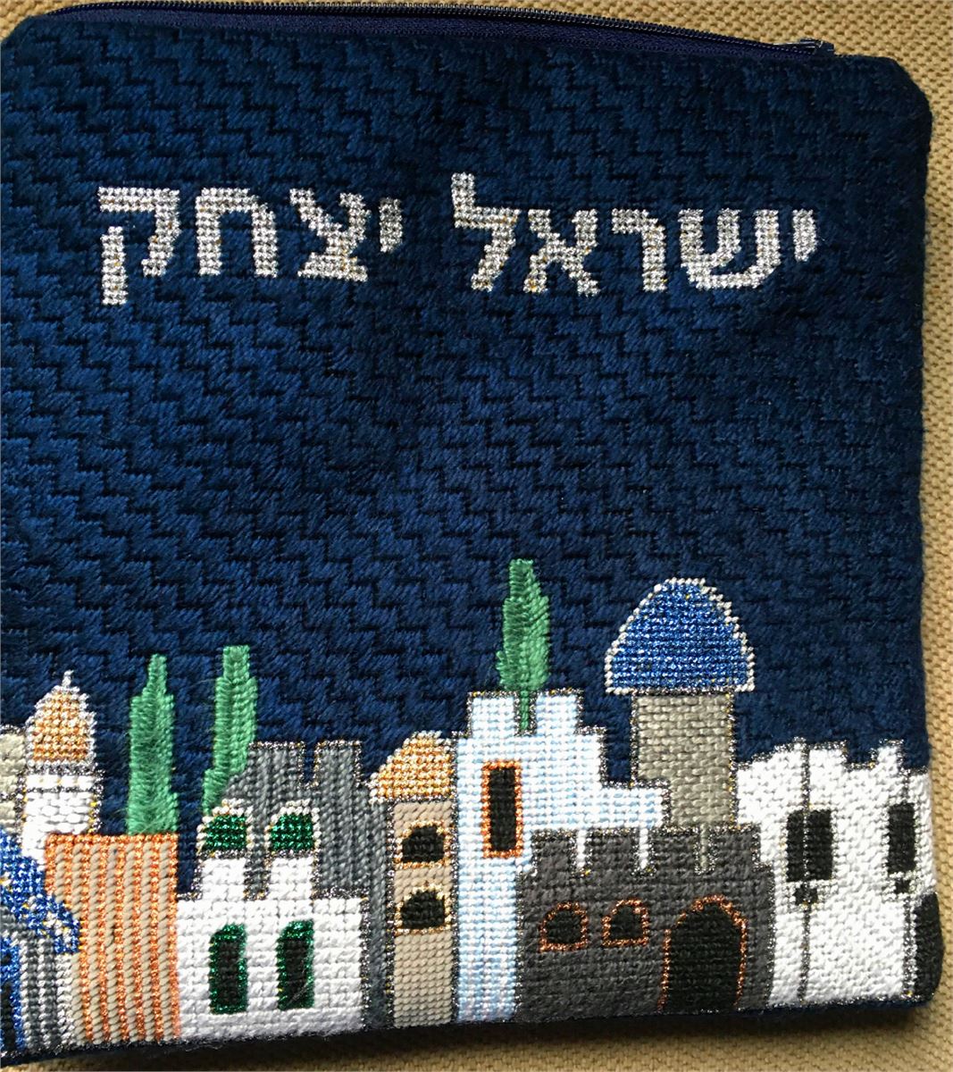 A tefillin bag with the Jerusalem skyline lighting up the night. A classic beauty in needlepoint tefillin designs. Jerusalem scenes are very popular judaica designs. Tefillin are gifted to a Jewish boy upon his bar mitzvah when he turns thirteen. He is taught how to perfom this holy Mitzvah properly before his birthday. You stitch the front. After it is completely stitched, it is sent to a professional finisher who adds a lining, back, and matching zipper.
