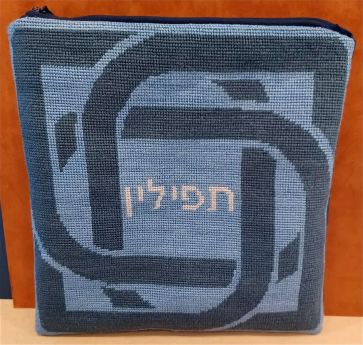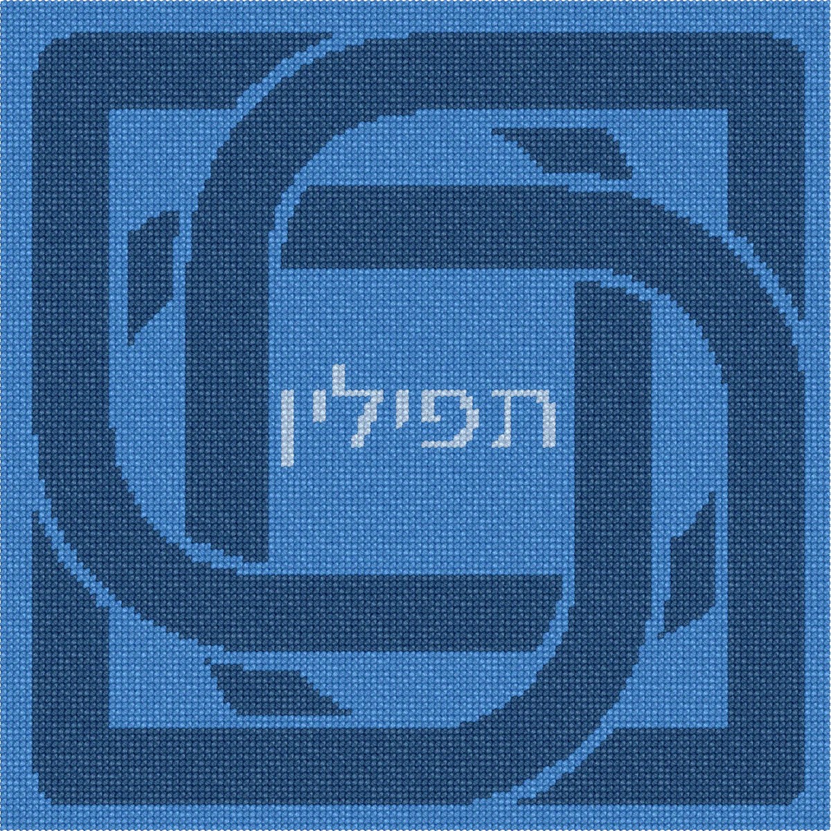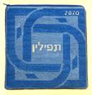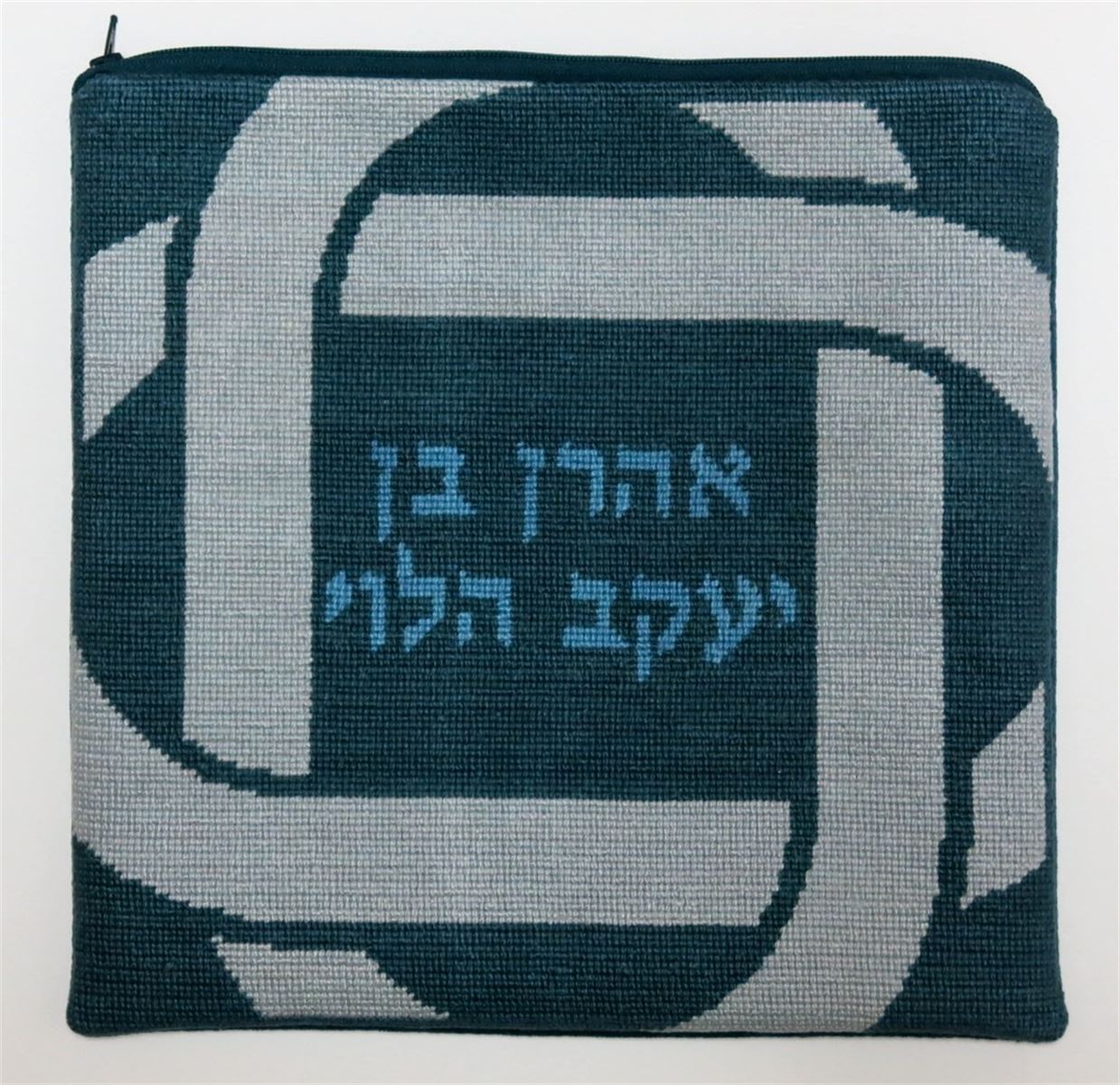 Tefillin bag design with knot border. See coordinating tallit bag design. Mazel Tov on the bar mitzvah of your loved one. Geometrics are very vogue in tallit and tefillin bags today. You stitch the front. After it is completely stitched, it is sent to a professional finisher who adds a lining, back, and matching zipper. See coordinating tefillin bag design.