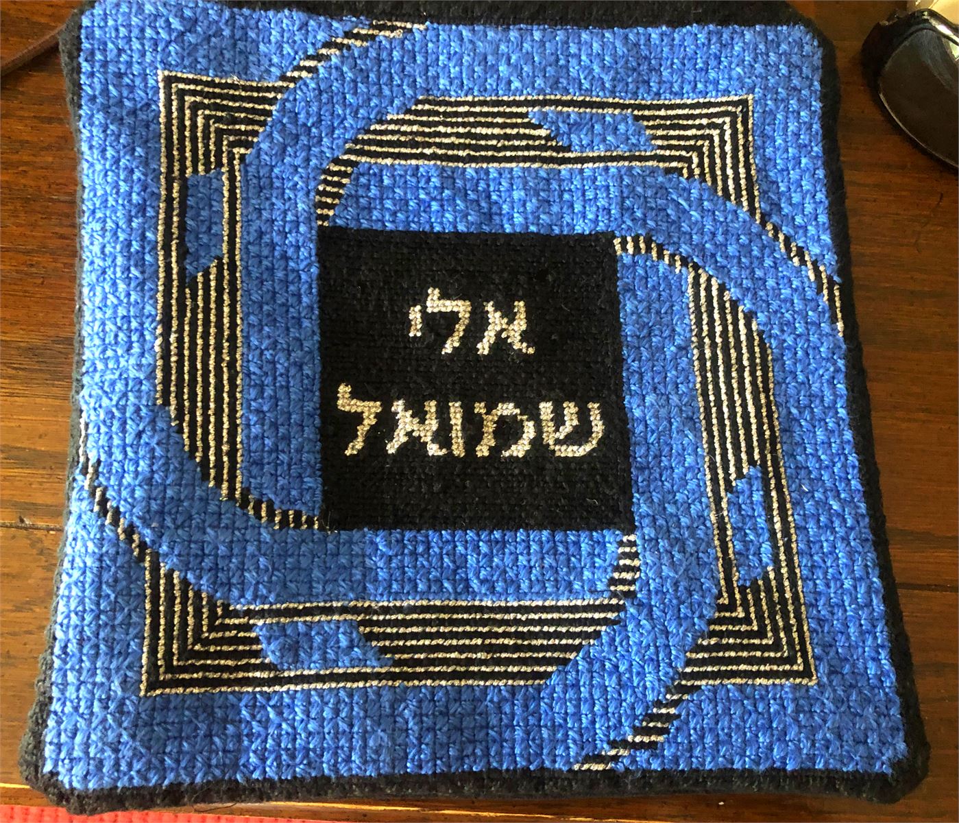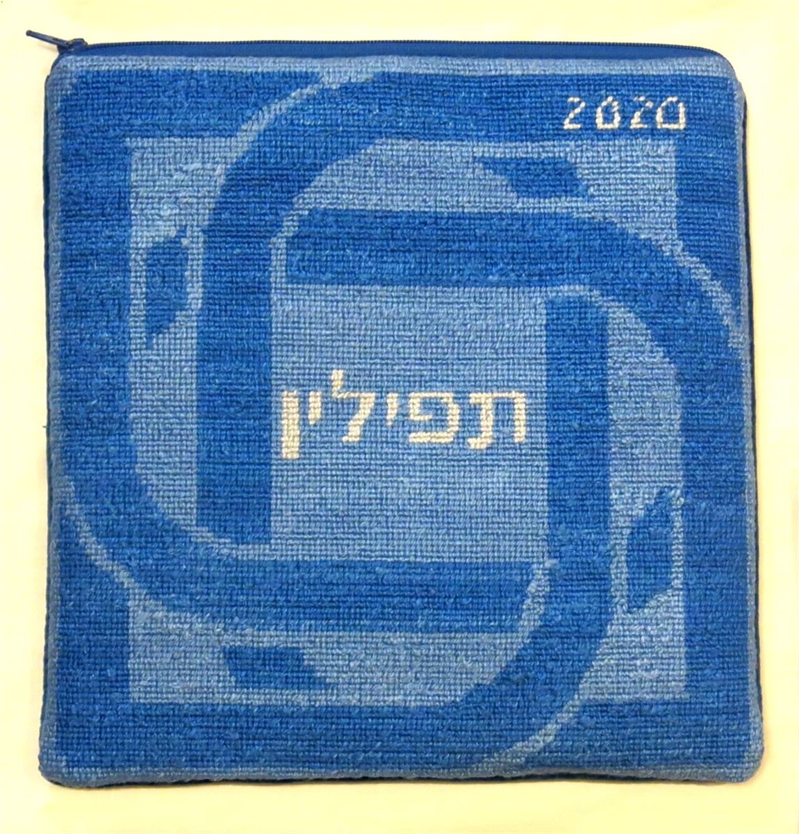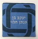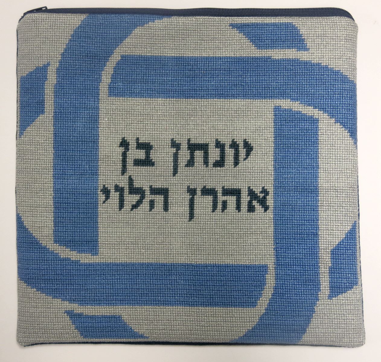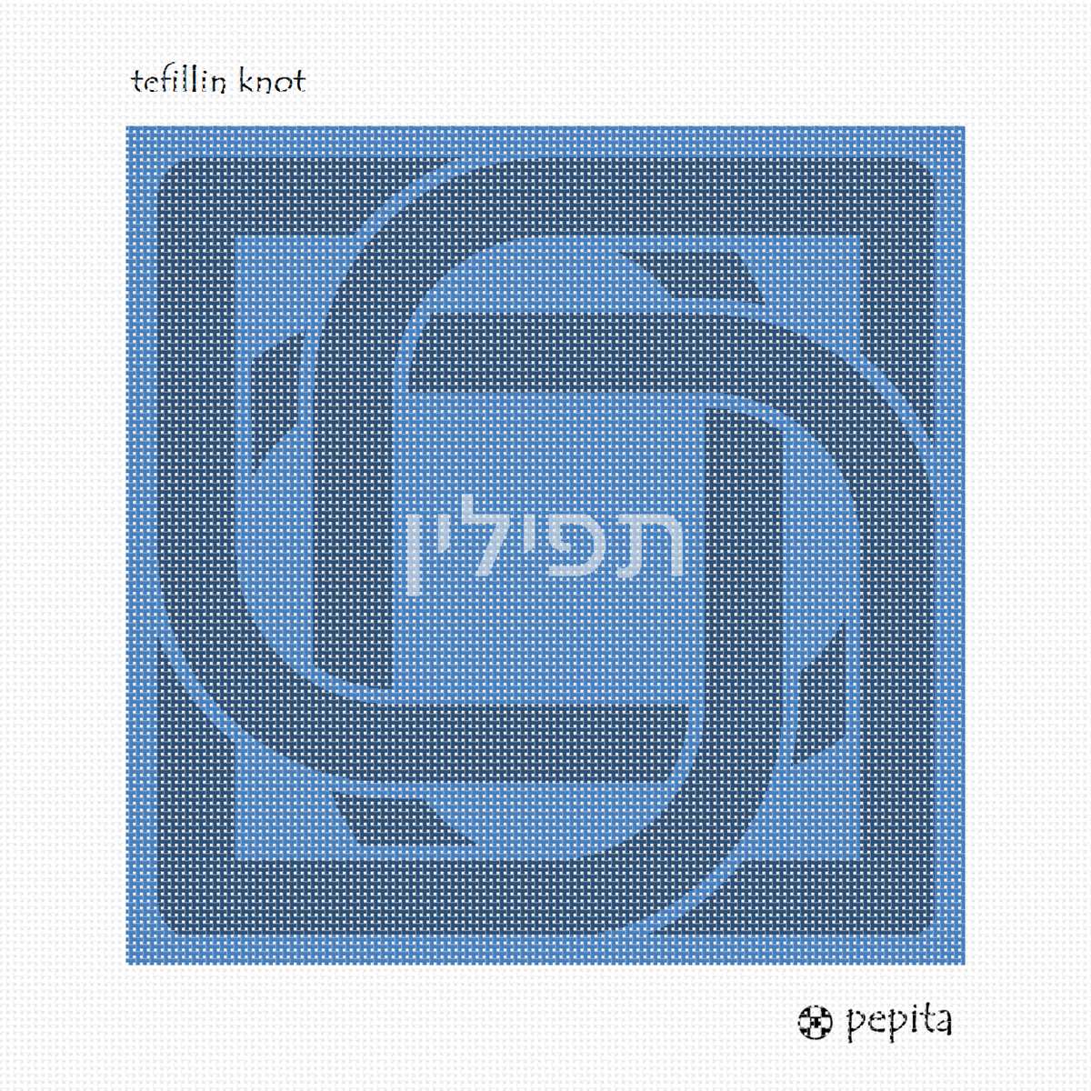Tefillin bag design with knot border. See coordinating tallit bag design. Mazel Tov on the bar mitzvah of your loved one. Geometrics are very vogue in tallit and tefillin bags today. You stitch the front. After it is completely stitched, it is sent to a professional finisher who adds a lining, back, and matching zipper. See coordinating tefillin bag design.