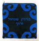Tefillin design in shades of blue. See matching tallit bag. Geometrics are very vogue in tallit and tefillin bags today. You stitch the front. After it is completely stitched, it is sent to a professional finisher who adds a lining, back, and matching zipper.