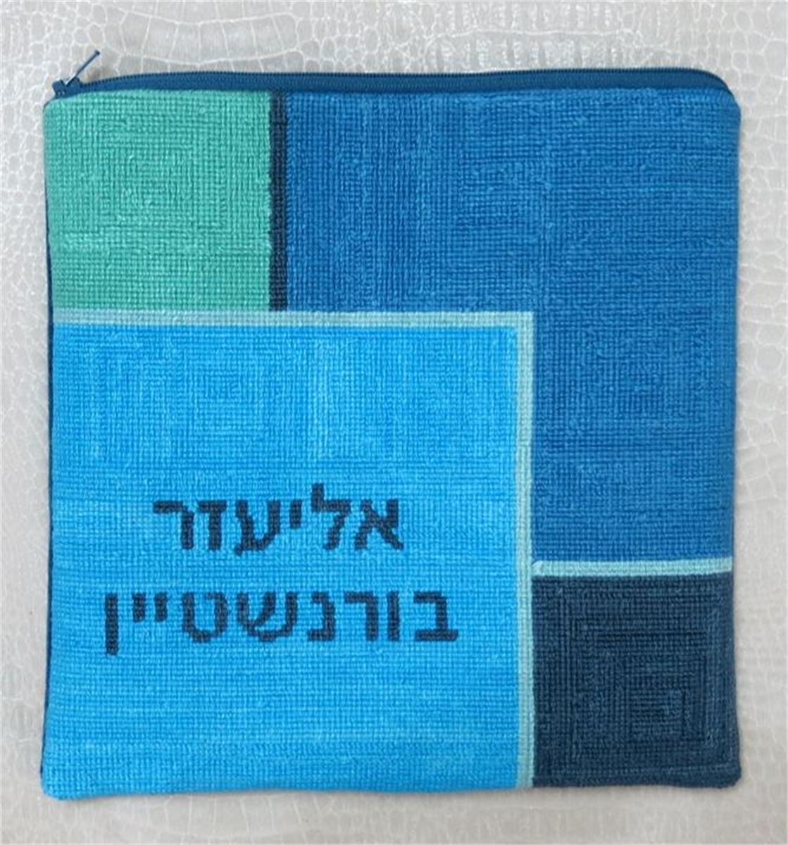Overlapping shapes and squares. See matching tallit bag. Geometrics are very vogue in tallit and tefillin bags today. You stitch the front. After it is completely stitched, it is sent to a professional finisher who adds a lining, back, and matching zipper. Mazel Tov on the Bar Mitzvah!