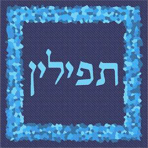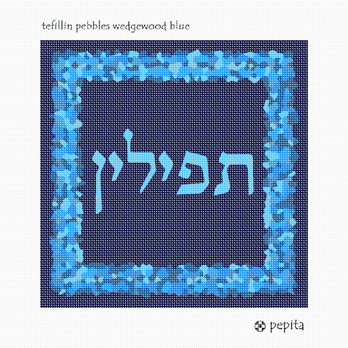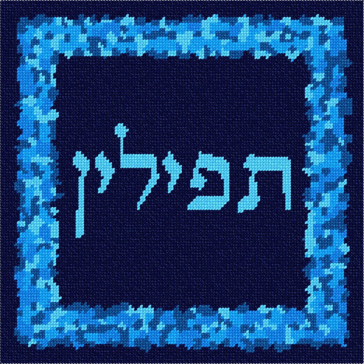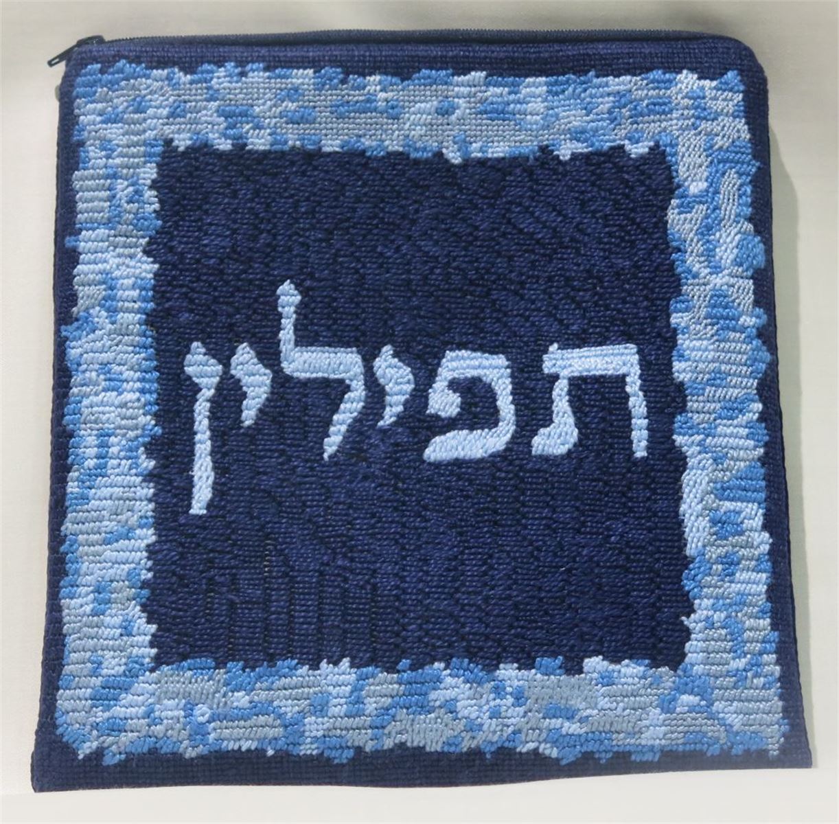Tefillin Bag in rich tones of blue with a pebble like border. This is very popular in needlepoint. See coordinating tallit bag design. You stitch the front. After it is completely stitched, it is sent to a professional finisher who adds a lining, back, and matching zipper. And Mazel Tov on the bar mitzvah!