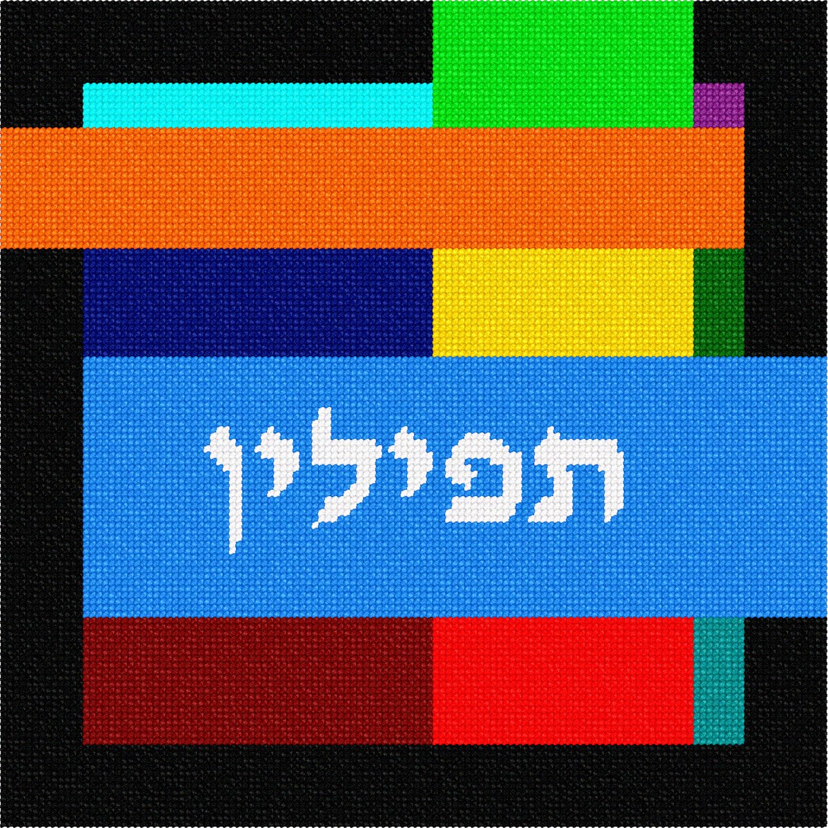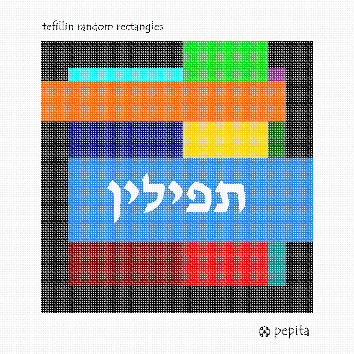 Vibrant tefillin needlepoint canvas. See matching tallit bag. Geometrics are very vogue in tallit and tefillin bags today. You stitch the front. After it is completely stitched, it is sent to a professional finisher who adds a lining, back, and matching zipper.