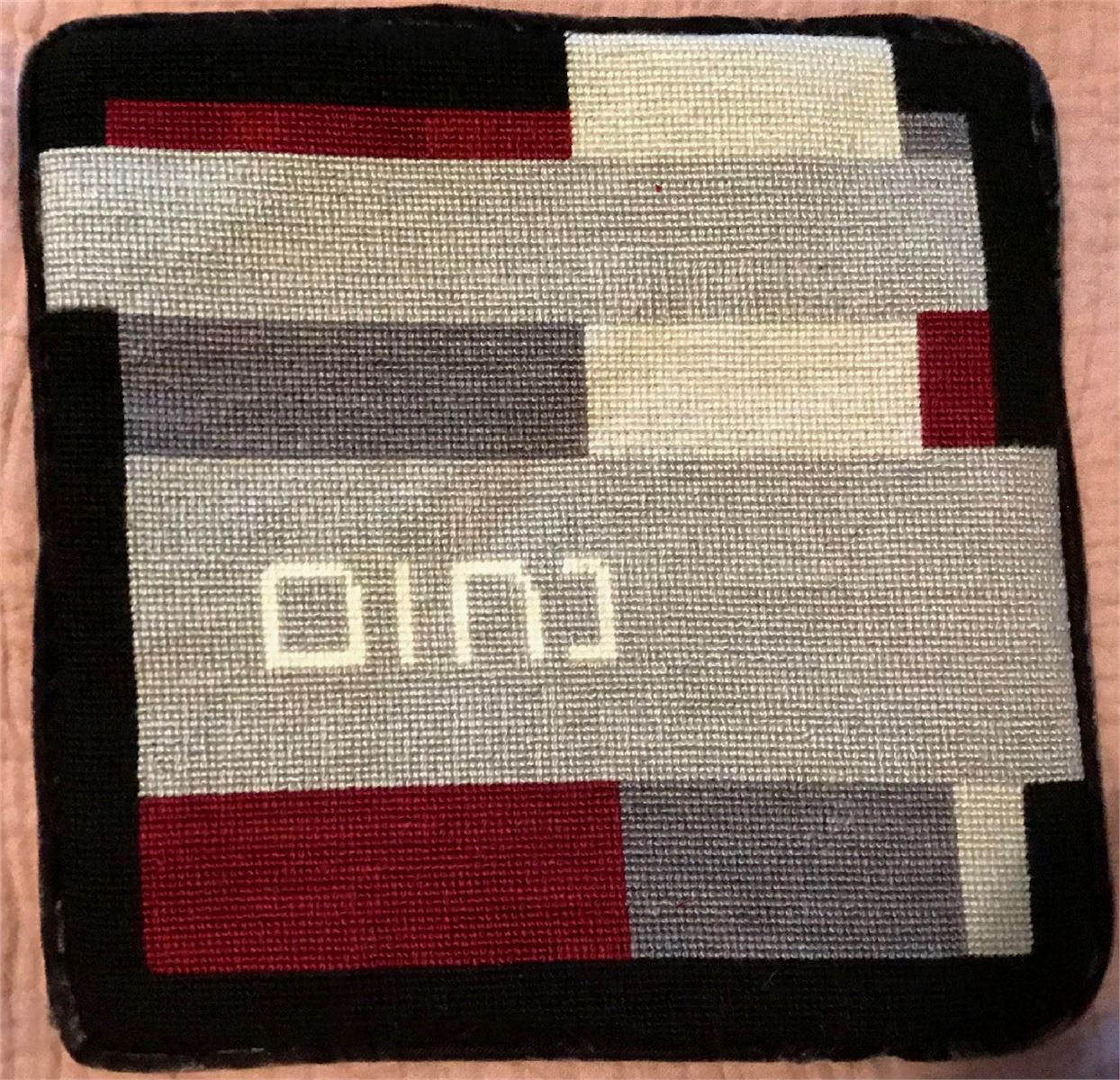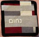 Tefillin random rectangles in greys and burgundy. See matching tallit bag. Geometrics are very vogue in tallit and tefillin bags today. You stitch the front. After it is completely stitched, it is sent to a professional finisher who adds a lining, back, and matching zipper.