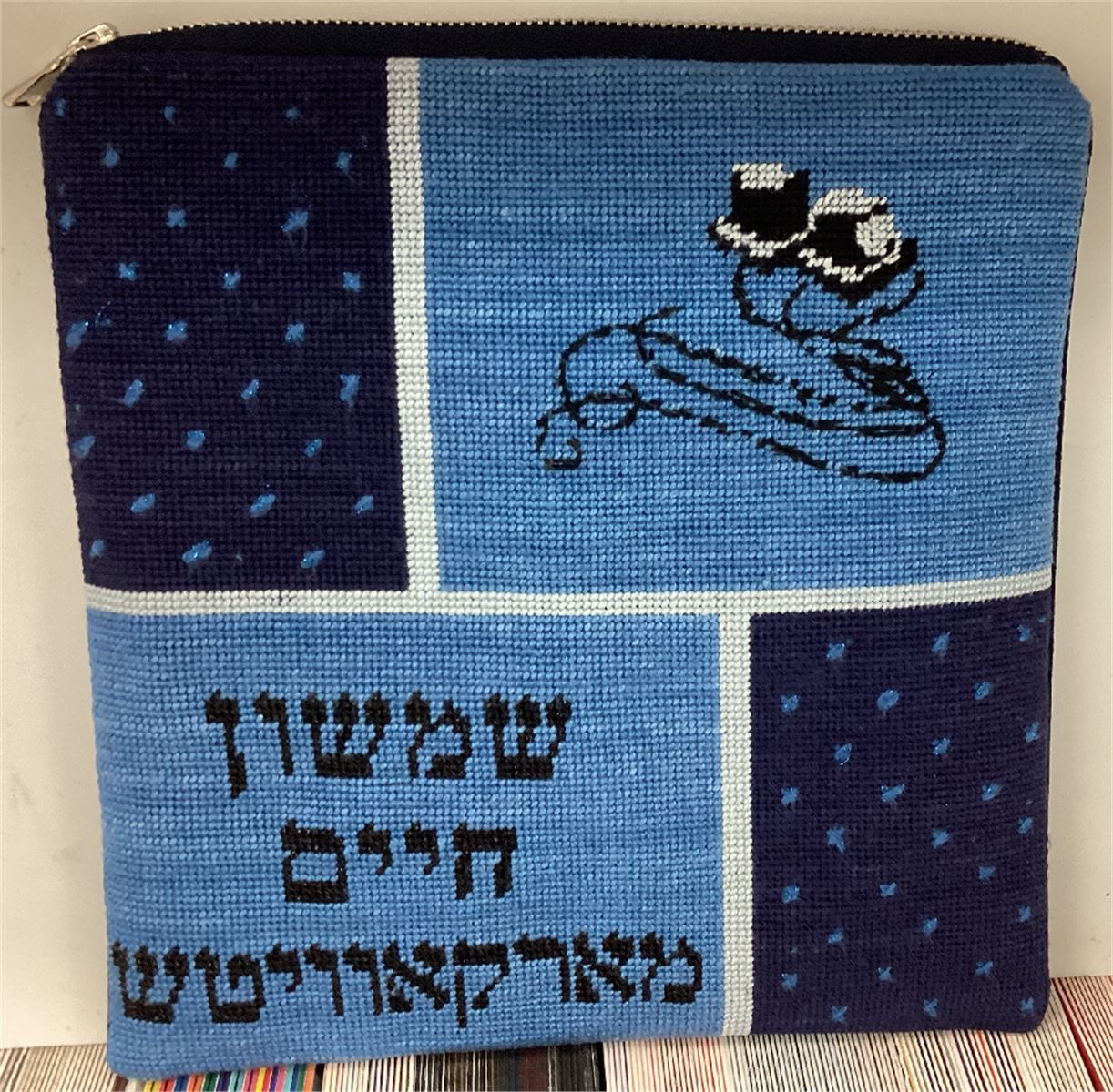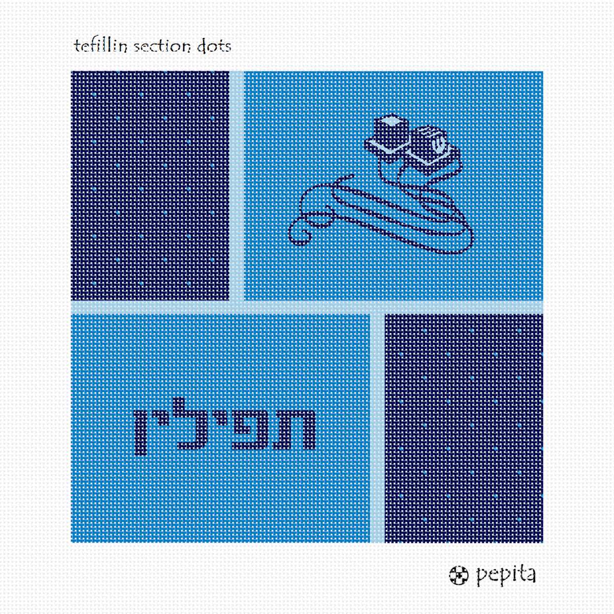 Tefillin are gifted to a Jewish boy upon his bar mitzvah when he turns thirteen. He is taught how to perfom this holy Mitzvah properly before his birthday. You stitch the front. After it is completely stitched, it is sent to a professional finisher who adds a lining, back, and matching zipper. This tefillin bag is fun to stitch. The polka dots enhance the design, and the vivid shades of blue pair well with one another.