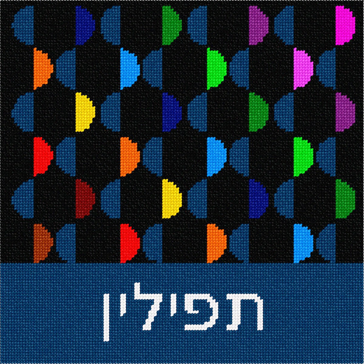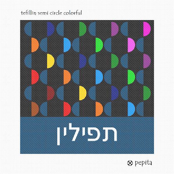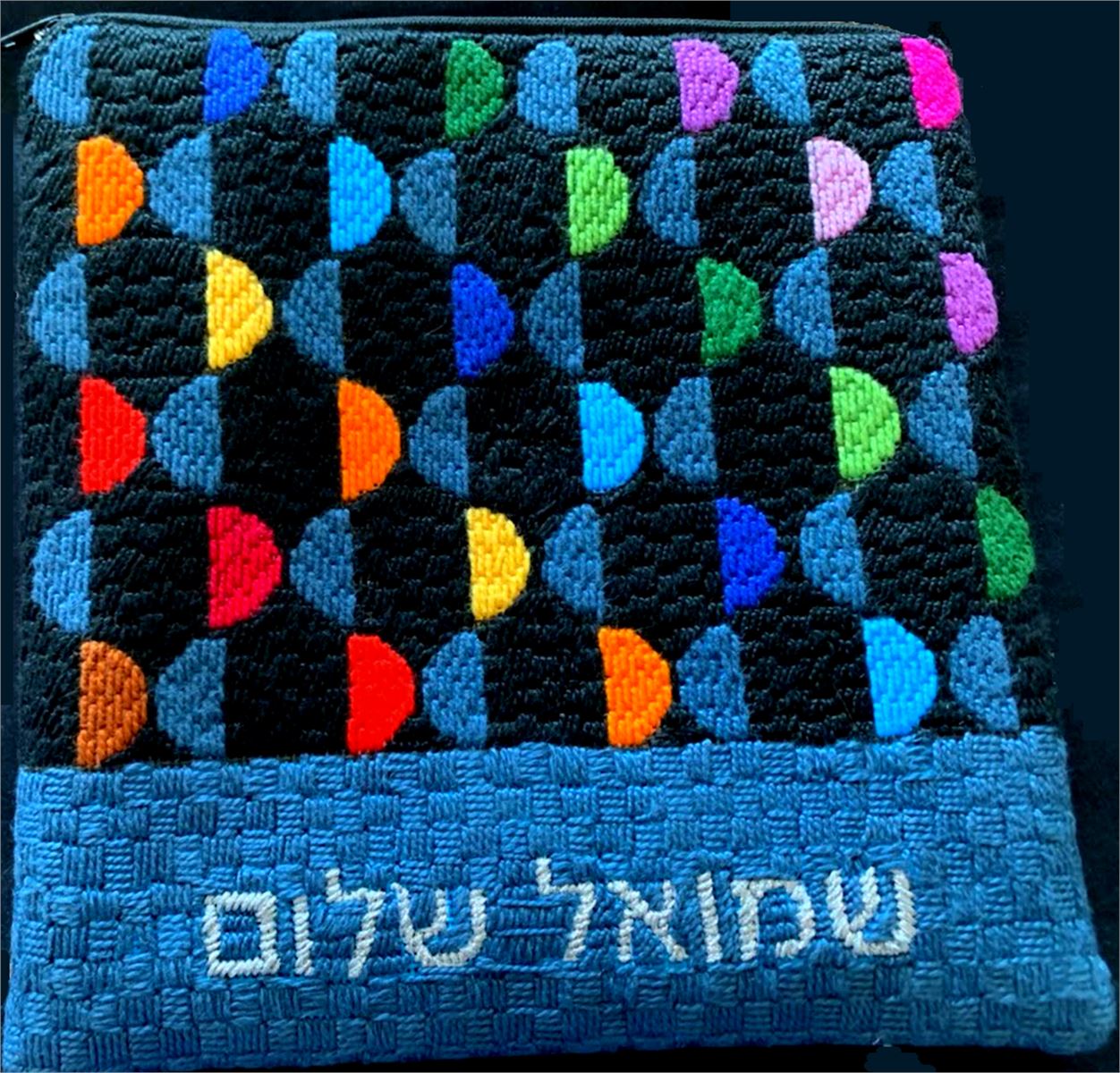 Stunning colorful geometric like bag. See coordinating tallit design. Geometrics are very vogue in tallit and tefillin bags today. You stitch the front. After it is completely stitched, it is sent to a professional finisher who adds a lining, back, and matching zipper.