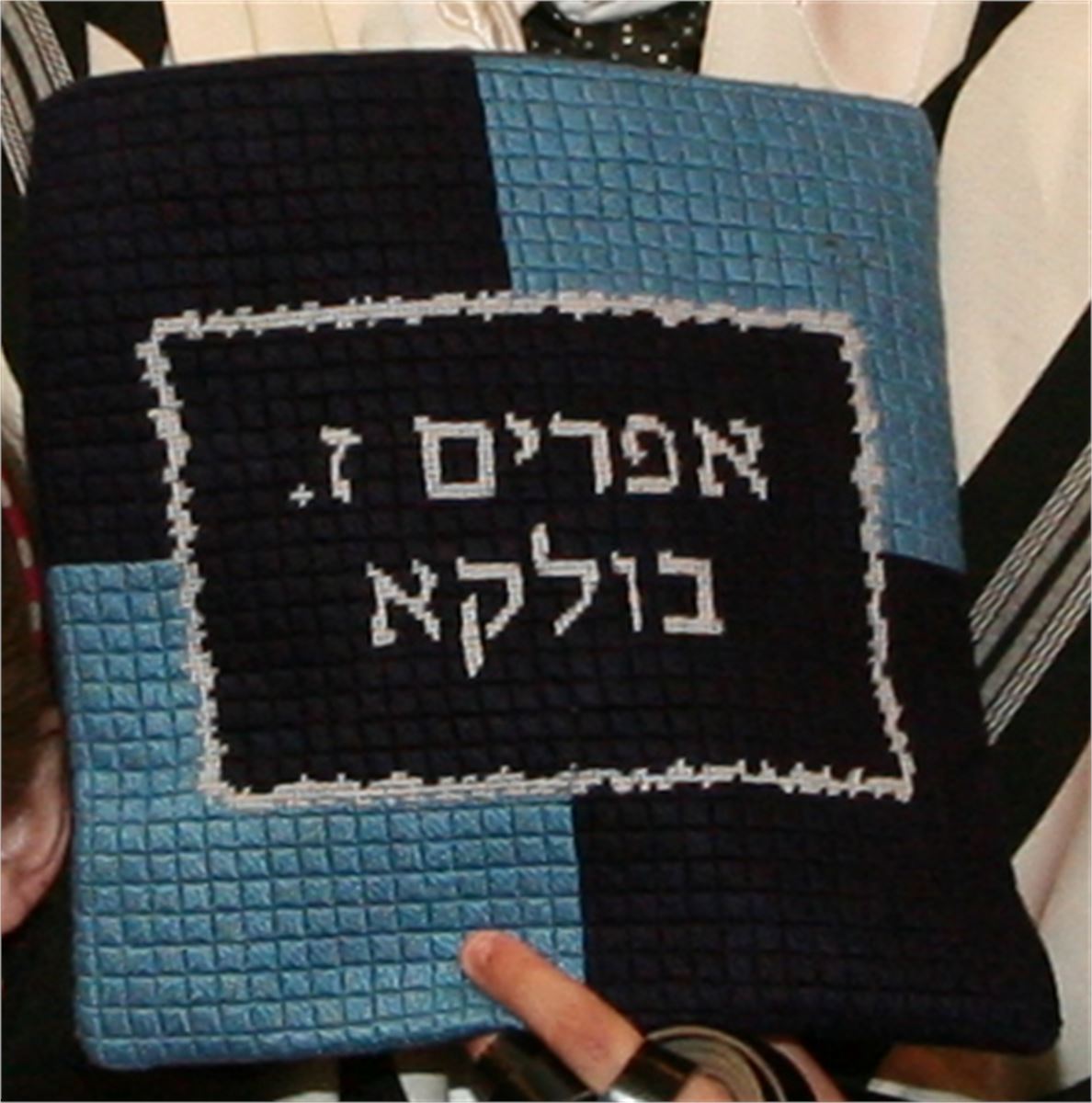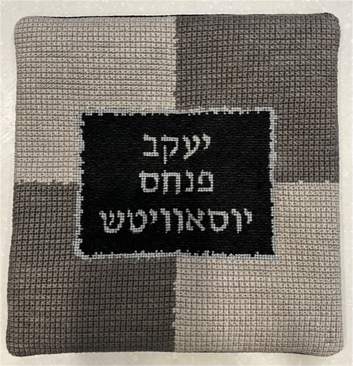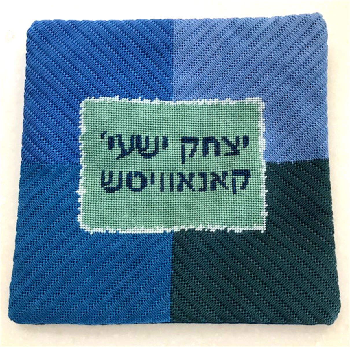 Tefillin Needlepoint Canvas in hues of blues. See matching tallit bag. Geometrics are very vogue in tallit and tefillin bags today. You stitch the front. After it is completely stitched, it is sent to a professional finisher who adds a lining, back, and matching zipper. Mazel Tov on the Bar Mitzvah!