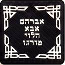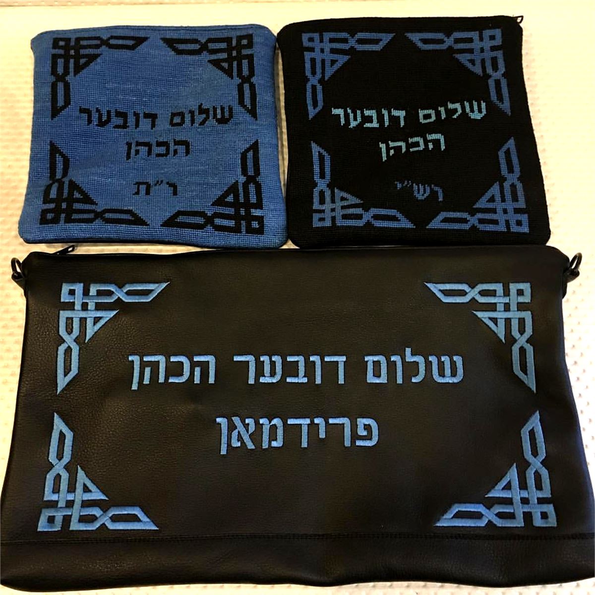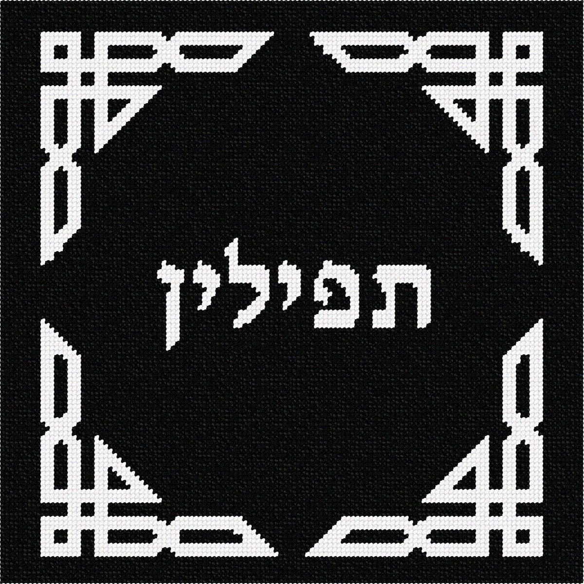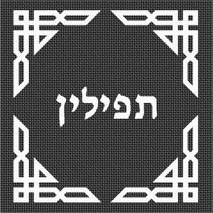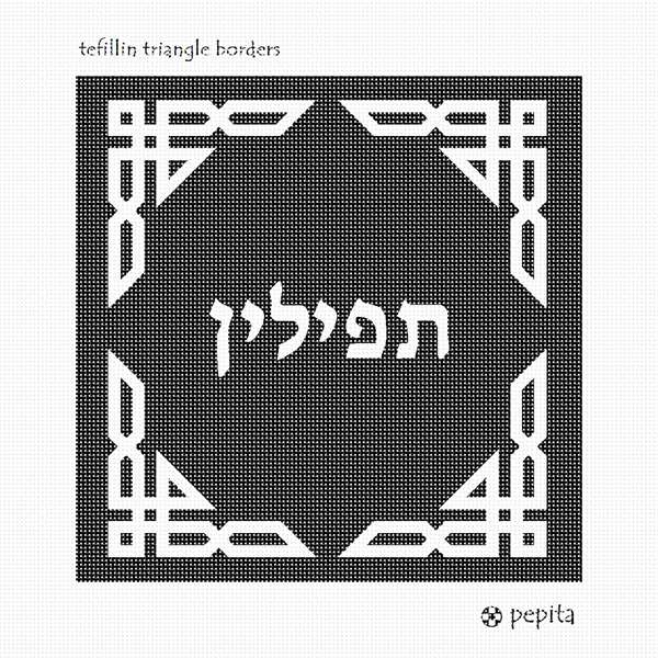 An elegant tefillin bag with fancy corners. See matching tallit bag. Geometrics are very vogue in tallit and tefillin bags today. You stitch the front. After it is completely stitched, it is sent to a professional finisher who adds a lining, back, and matching zipper.
