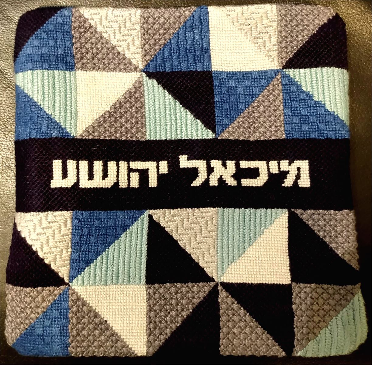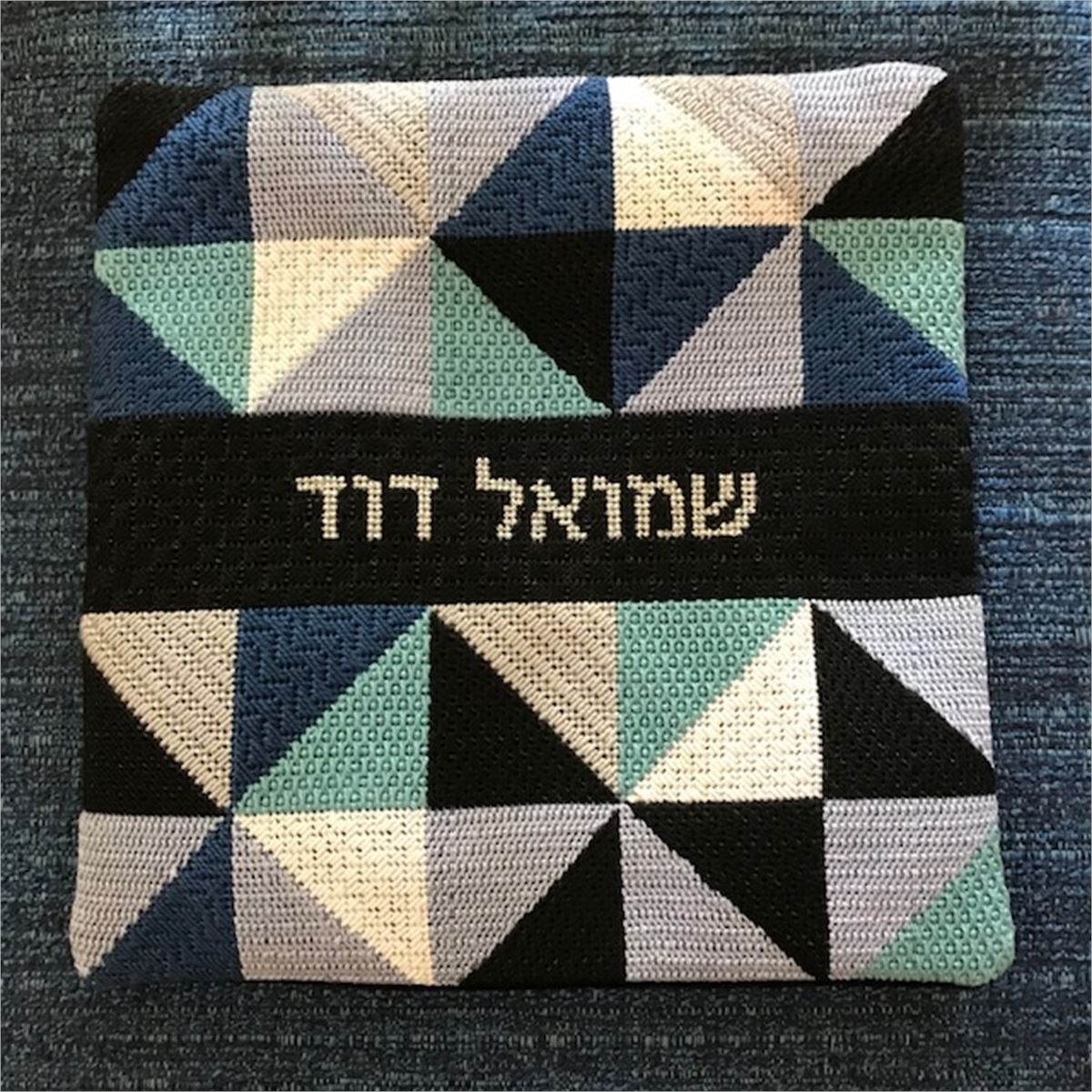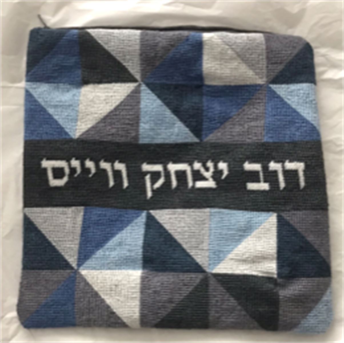 Intriguing Tefillin bag design using assortment of blue-shaded triangles and a black band across the middle for the name. See matching tallit bag. Geometrics are very vogue in tallit and tefillin bags today. You stitch the front. After it is completely stitched, it is sent to a professional finisher who adds a lining, back, and matching zipper.