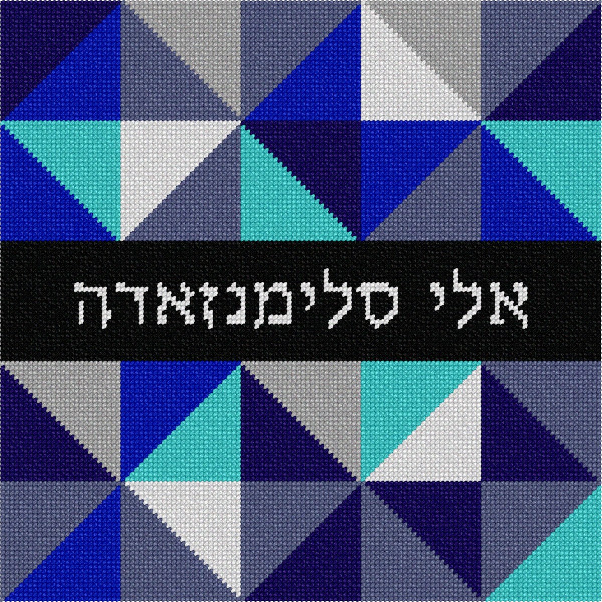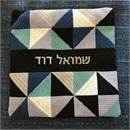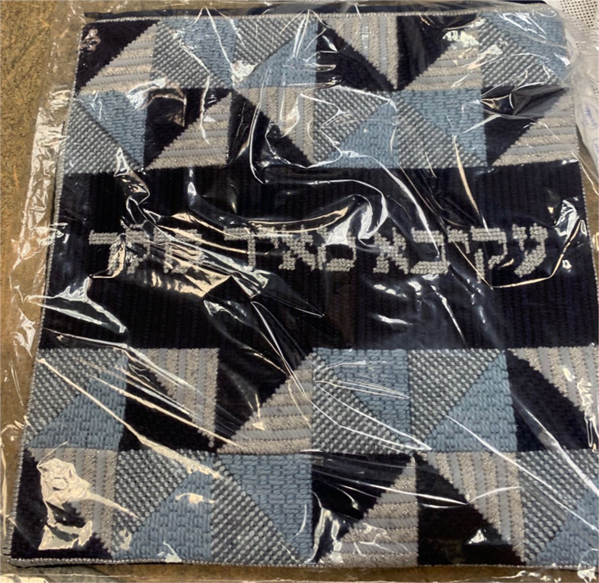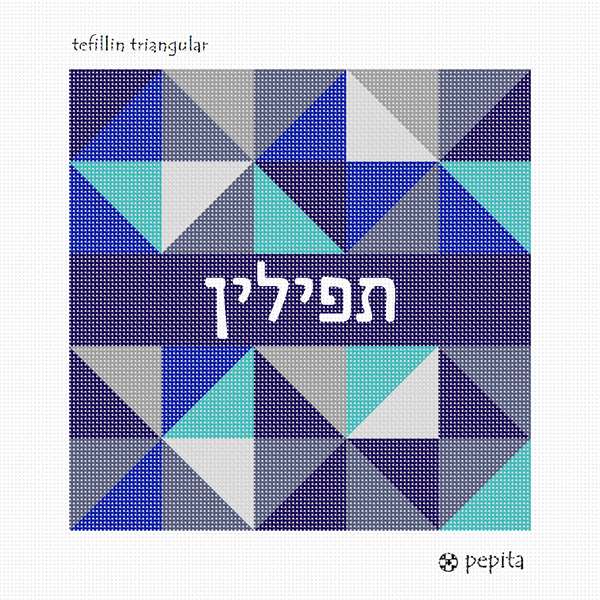 Intriguing Tefillin bag design using assortment of blue-shaded triangles and a black band across the middle for the name. See matching tallit bag. Geometrics are very vogue in tallit and tefillin bags today. You stitch the front. After it is completely stitched, it is sent to a professional finisher who adds a lining, back, and matching zipper.