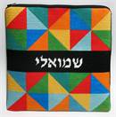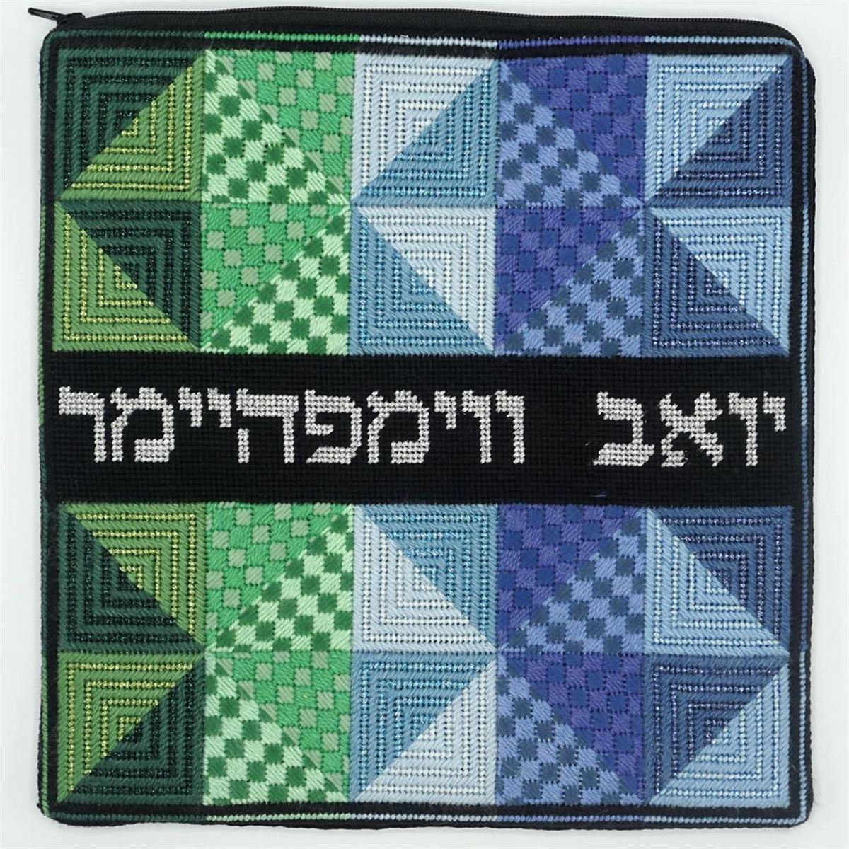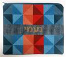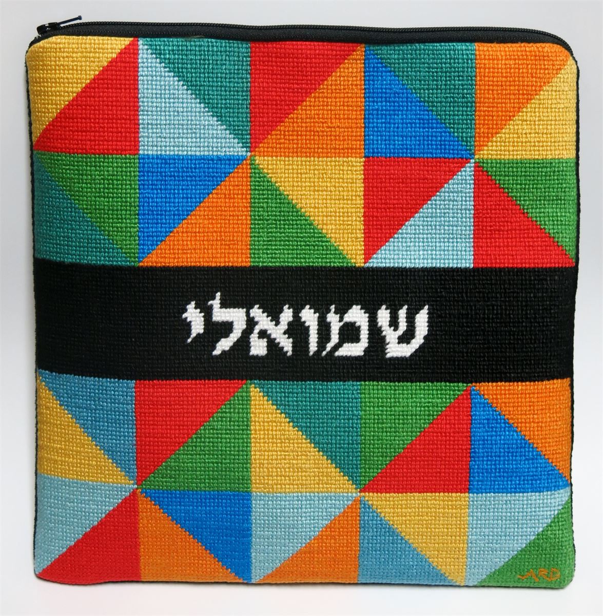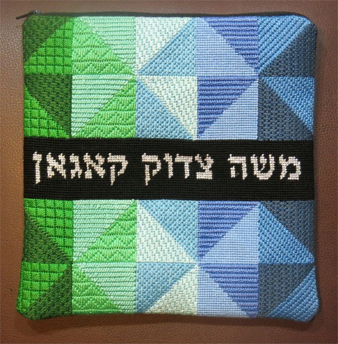 Triangles in shades of blues and greens. See matching tallit bag. Geometrics are very vogue in tallit and tefillin bags today. You stitch the front. After it is completely stitched, it is sent to a professional finisher who adds a lining, back, and matching zipper.