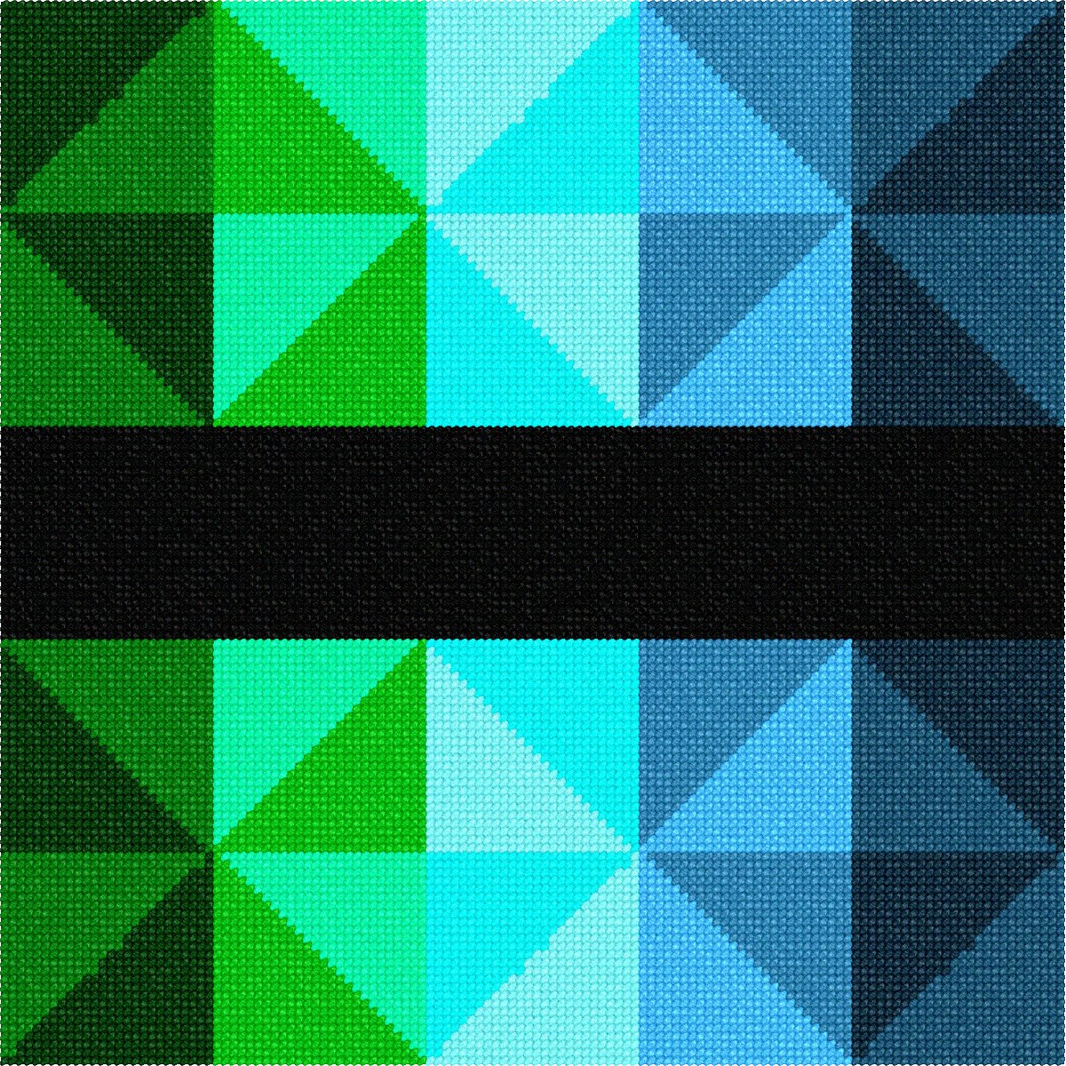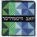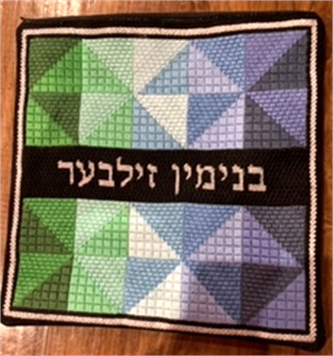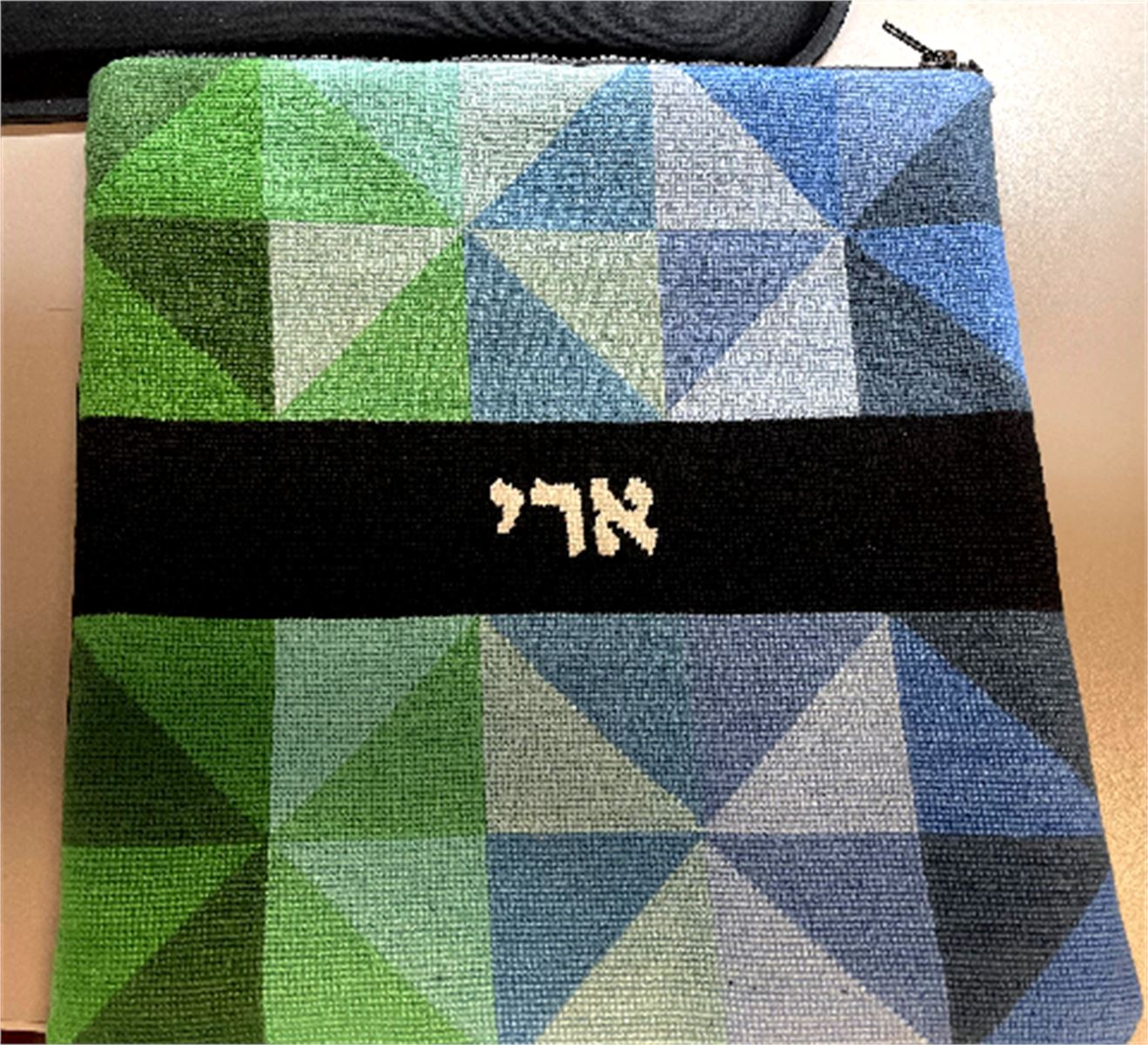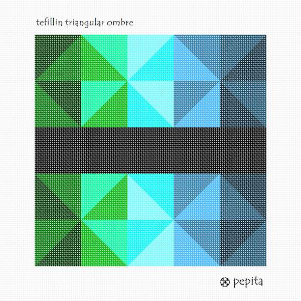 Triangles in shades of blues and greens. See matching tallit bag. Geometrics are very vogue in tallit and tefillin bags today. You stitch the front. After it is completely stitched, it is sent to a professional finisher who adds a lining, back, and matching zipper.