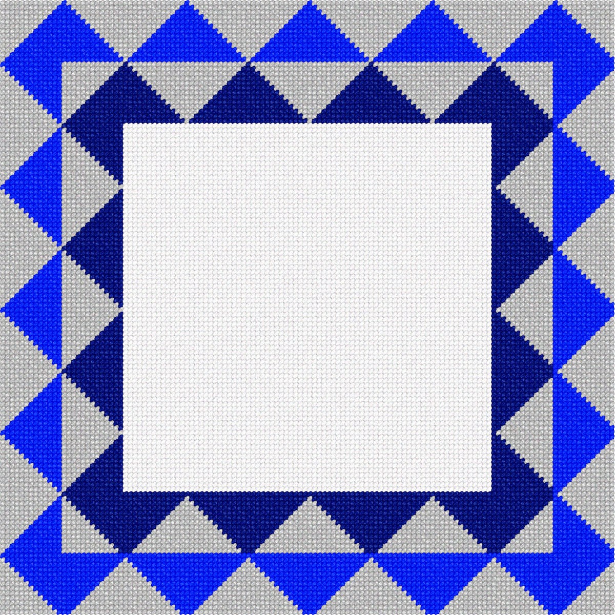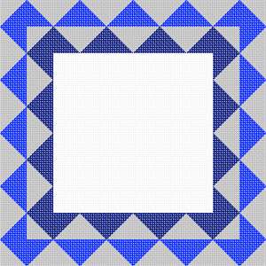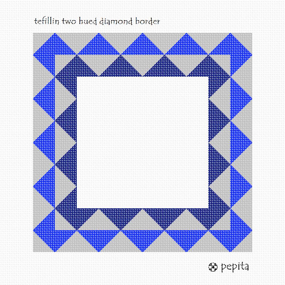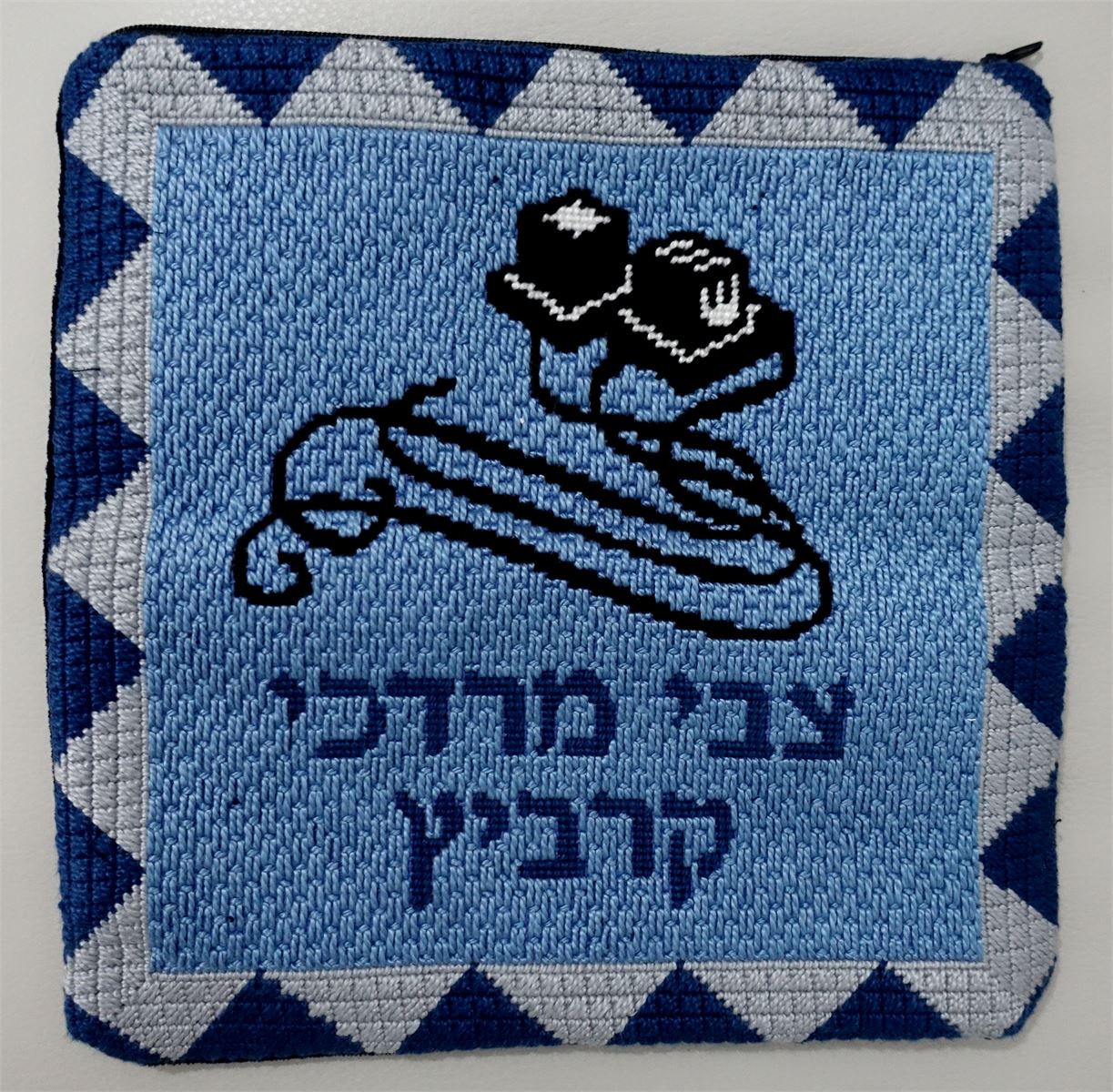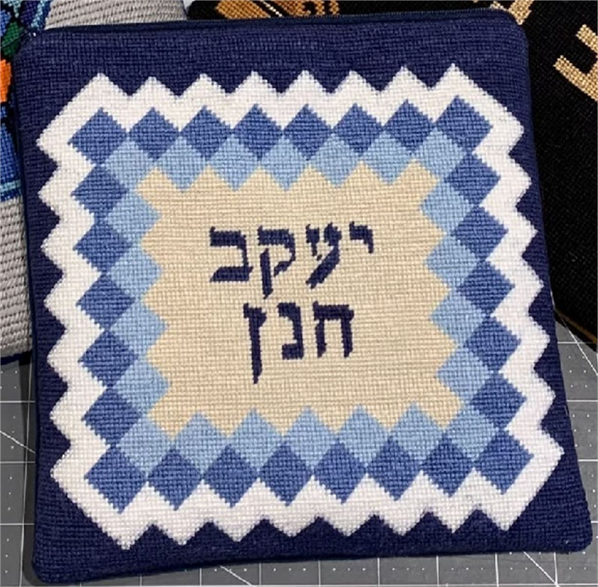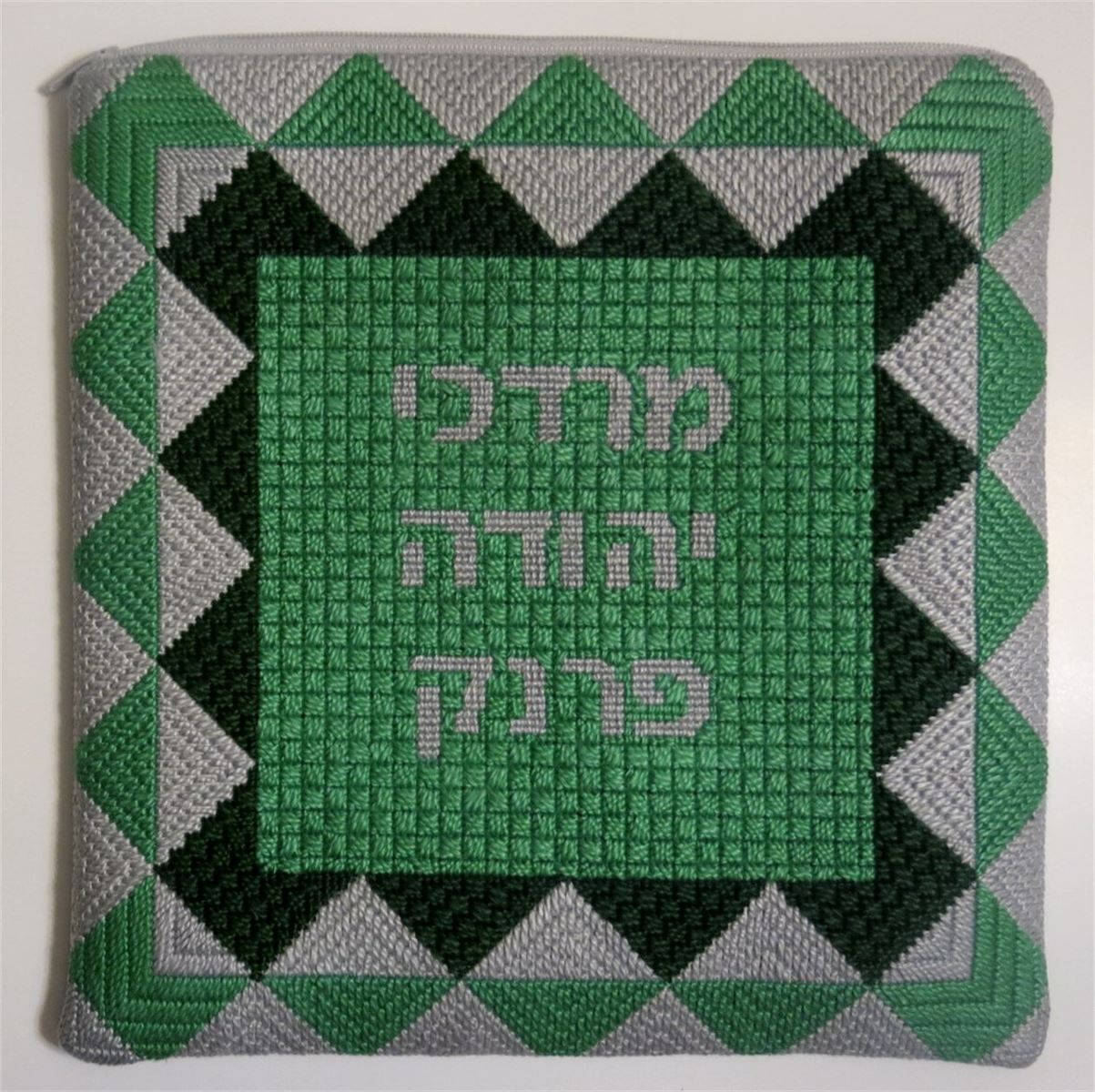 Border of inset two-hued diamond shapes. Space in the center for a name. See matching tallit bag. Geometrics are very vogue in tallit and tefillin bags today. You stitch the front. After it is completely stitched, it is sent to a professional finisher who adds a lining, back, and matching zipper.