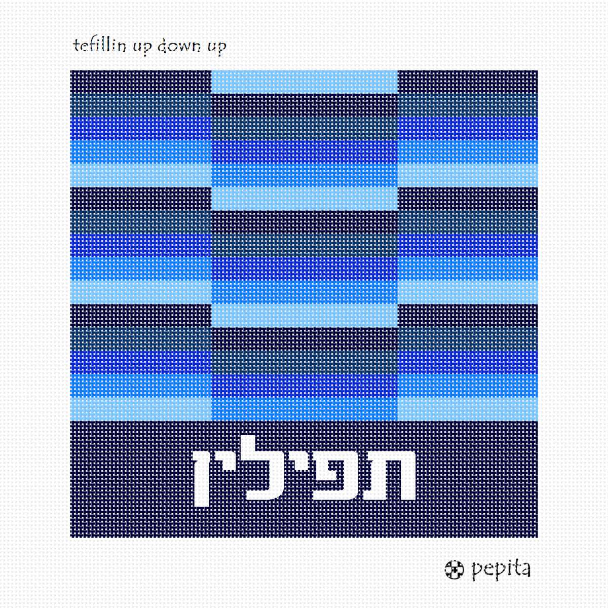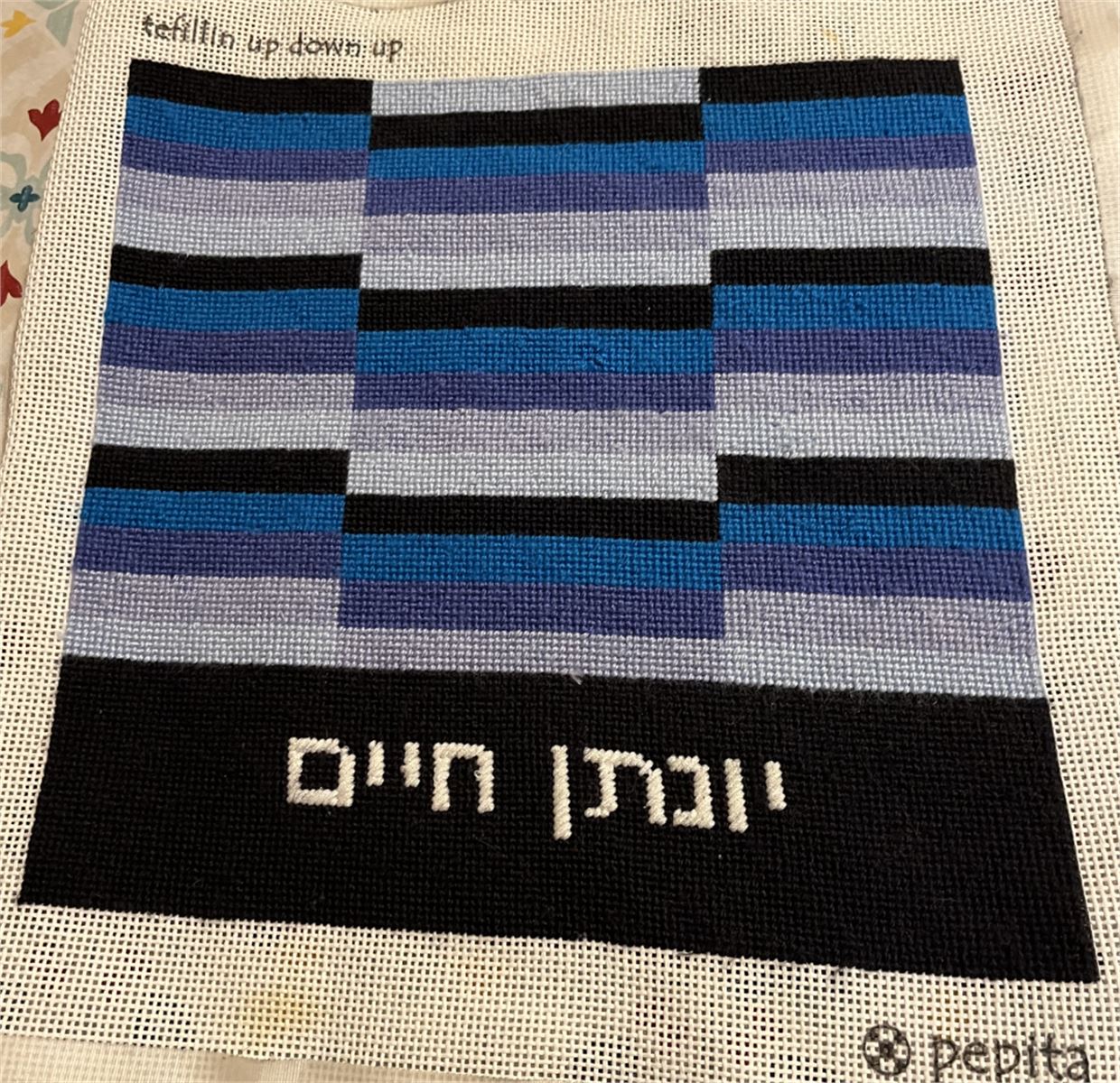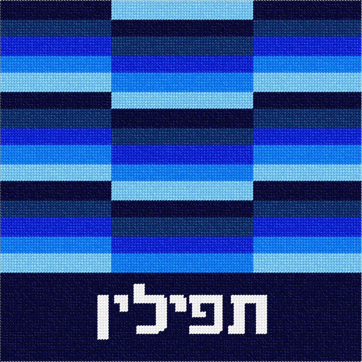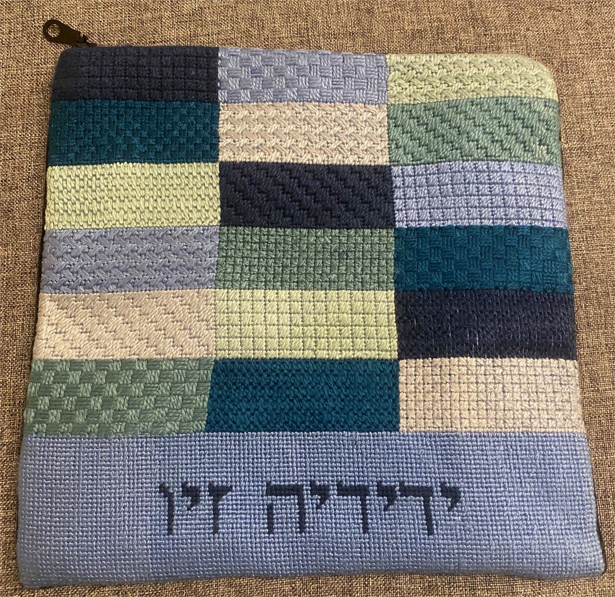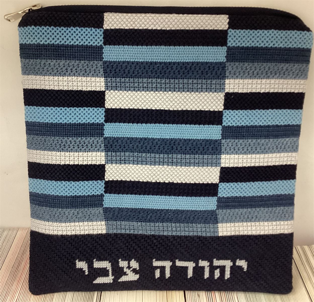 Sharp geometric tefillin bag design. Geometrics are very vogue in tallit and tefillin bags today. And the ombre makes it even more interesting. You stitch the front. After it is completely stitched, it is sent to a professional finisher who adds a lining, back, and matching zipper. See coordinating tallit bag design. And Mazel Tov on the bar mitzvah!