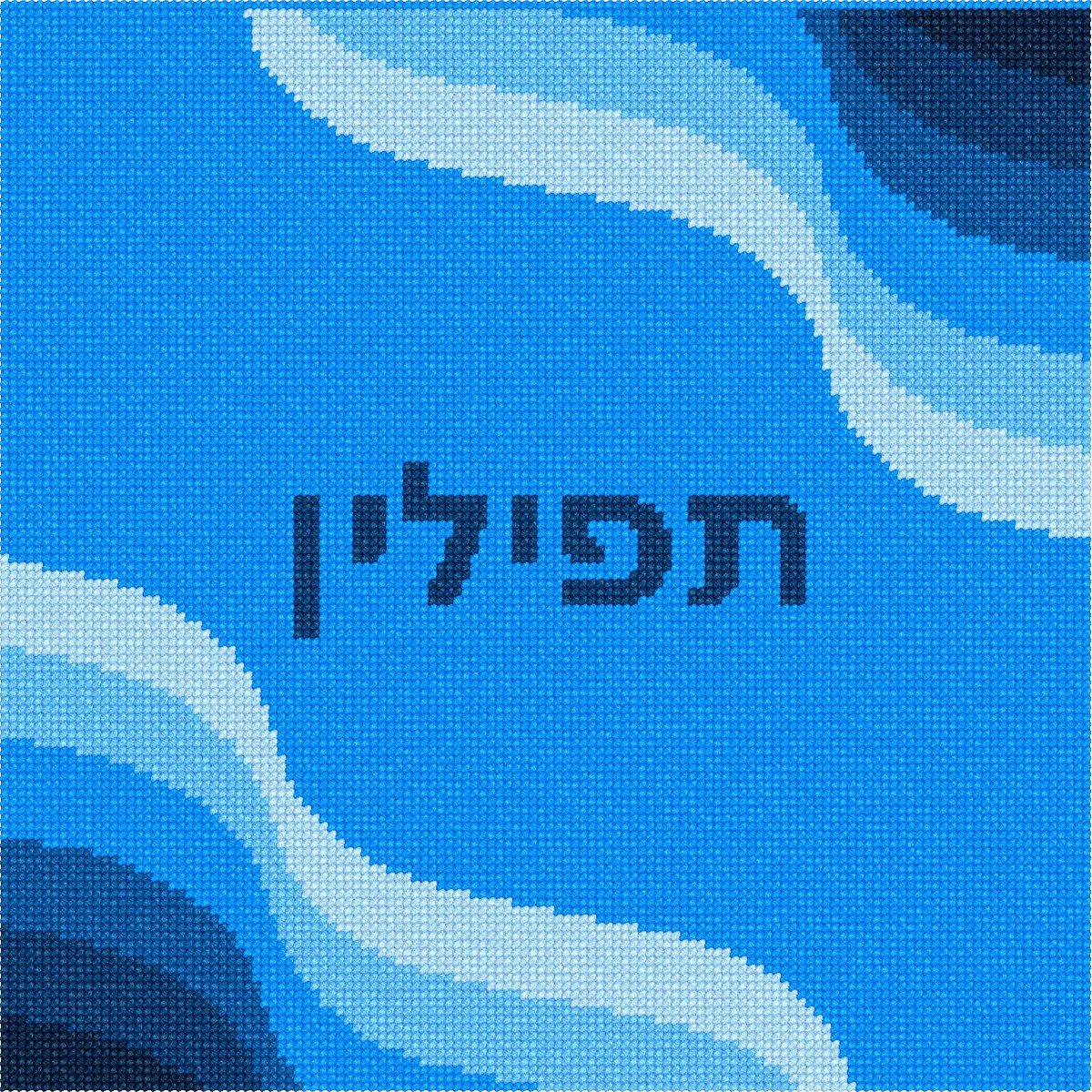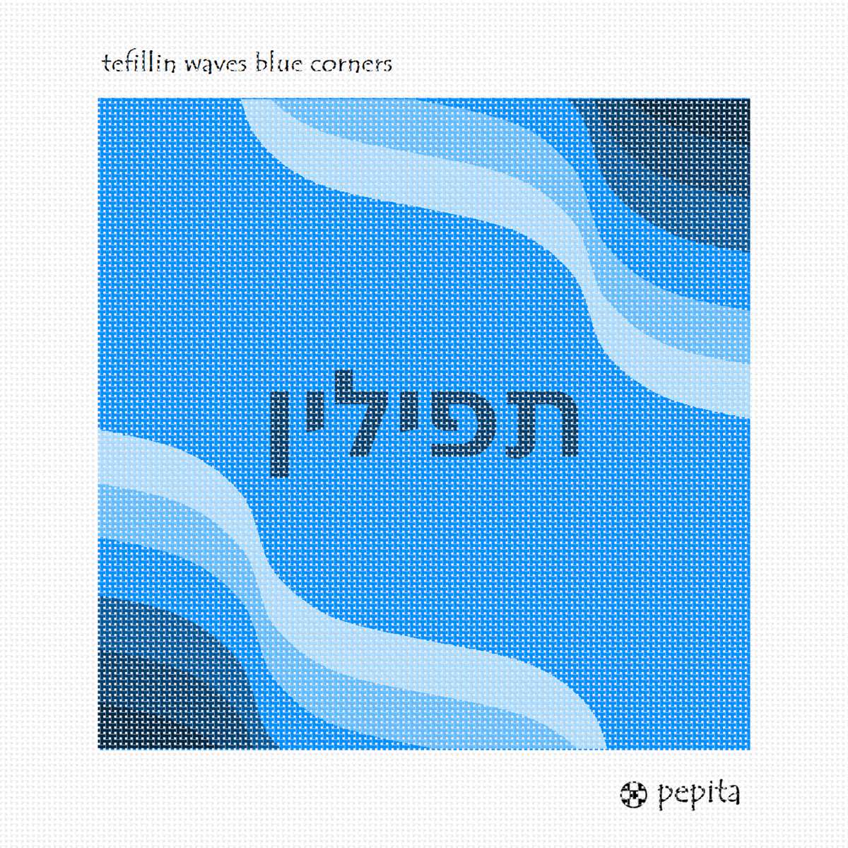 This design is based on our popular wave tallit and tefillin needlepoint canvases. Here the waves are set in two corners on a diagonal. You stitch the front. After it is completely stitched, it is sent to a professional finisher who adds a lining, back, and matching zipper. See coordinating siddur cover.