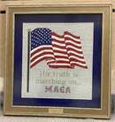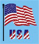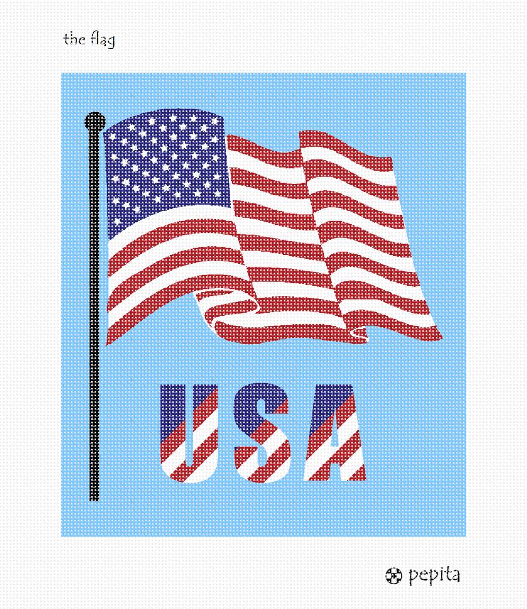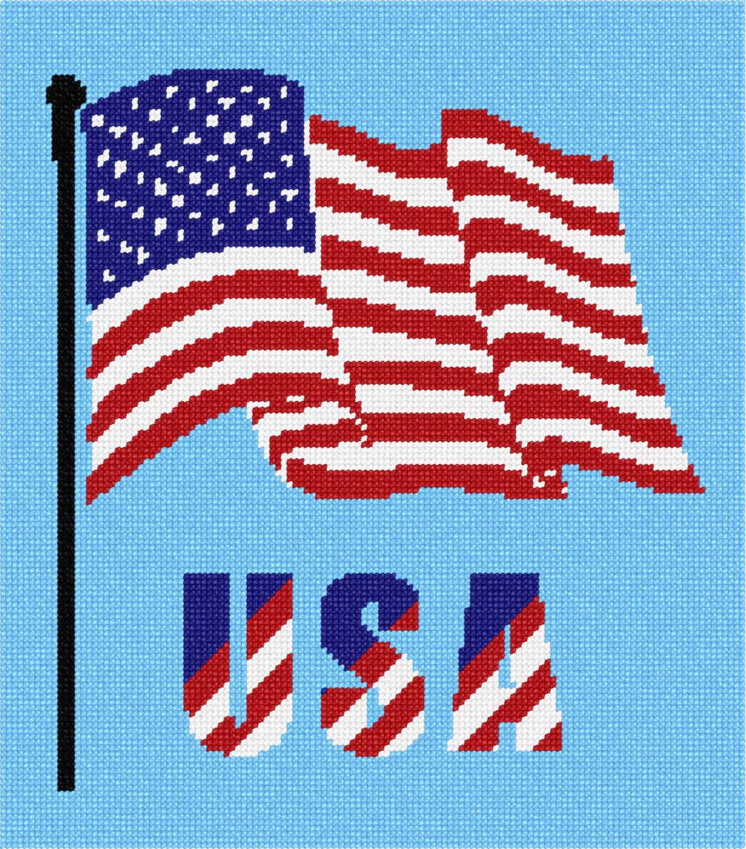 The American Flag in needlepoint in all its glory. The abbreviation USA is decked out in the flag pattern.