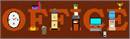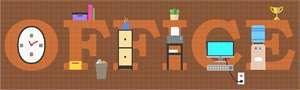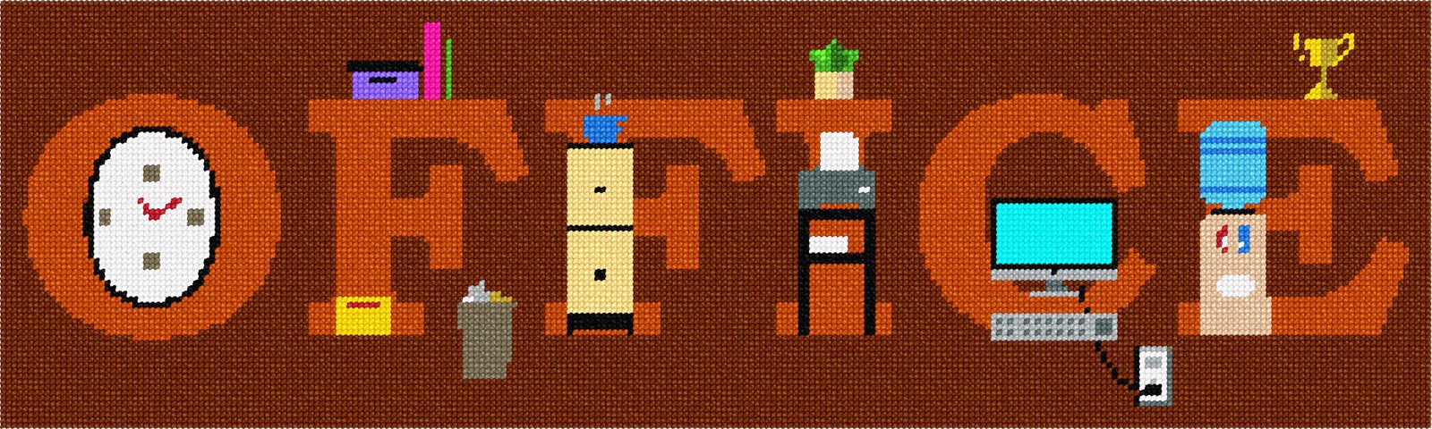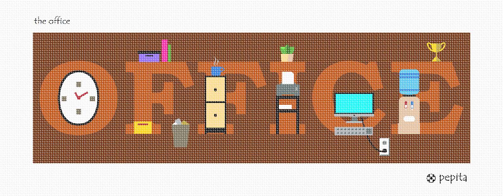 The word "Office" adorned with office themed items. The O features a clock. The first F has storage containers, and books. A trash can follows with the next F sporting a file cabinet with a hot drink resting on it. The I boasts the office printer along with a potted plant. The computer with an outlet and all adorns the C. A trophy sits on the E as well as the famous water cooler in the office. Stitch this for your actual office or your home office.