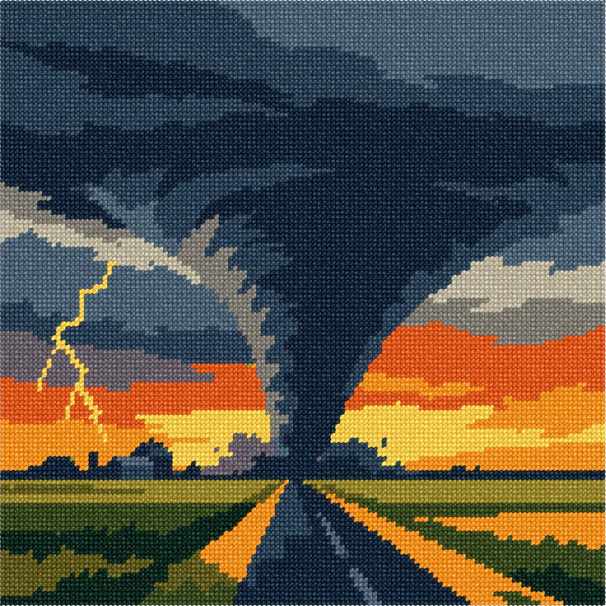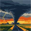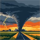 A dramatic tornado dominates the landscape, swirling amidst a captivating mix of dark clouds and a vibrant sunset. The striking color palette of deep grays and fiery oranges creates an intense, atmospheric mood. A bolt of lightning adds dynamic energy to the scene, highlighting the raw power of nature.