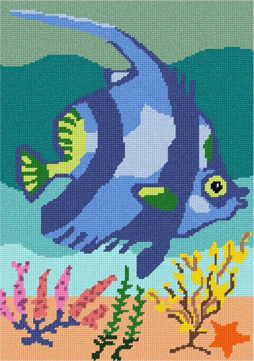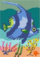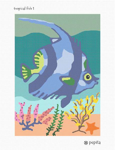 A tropical fish, against a marine theme backdrop. Marine plants cover the sea floor.