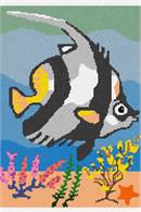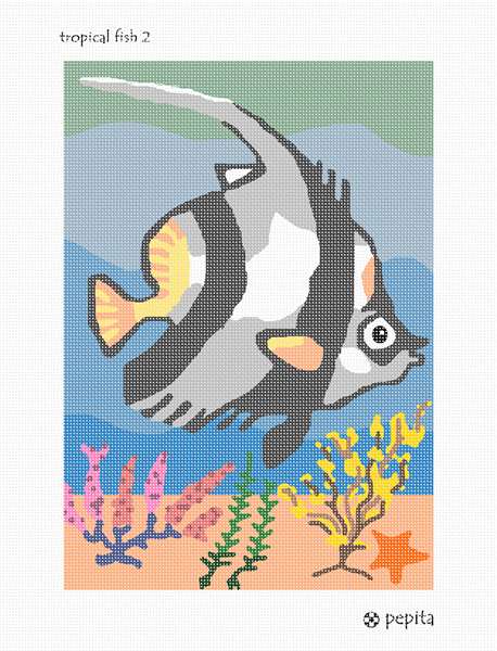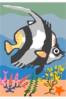 A tropical fish, against a marine theme backdrop. Marine plants cover the sea floor.