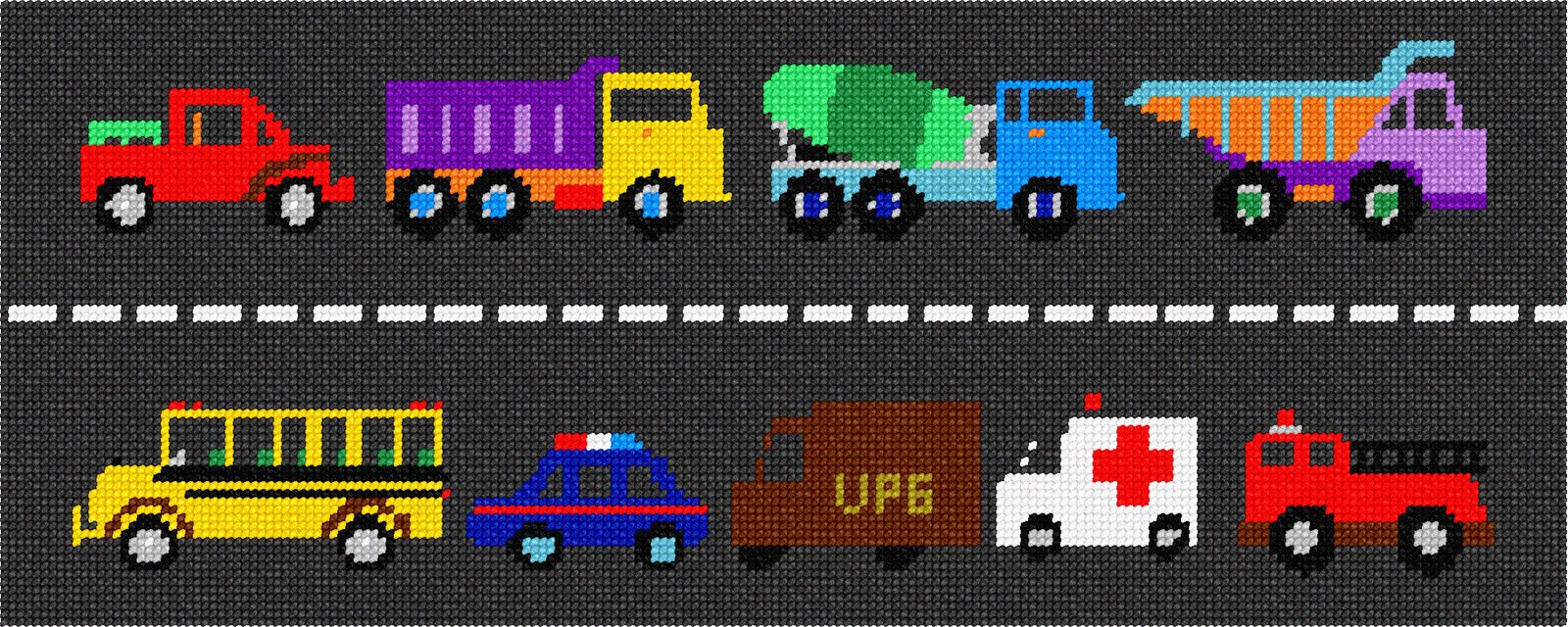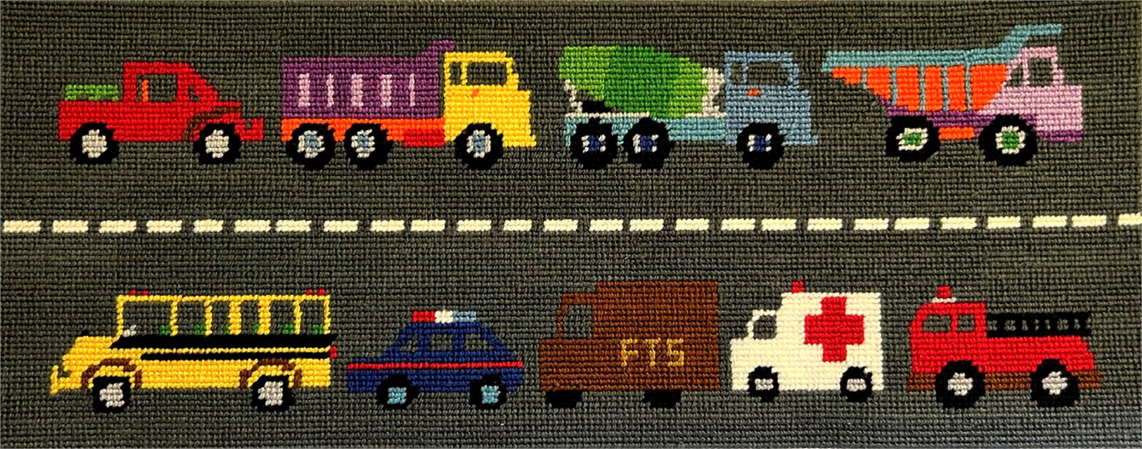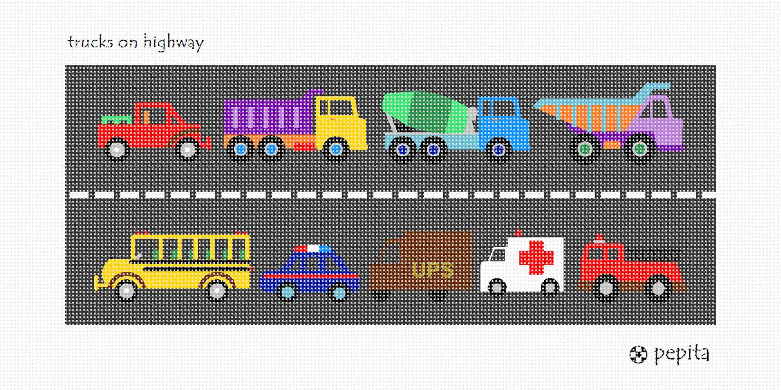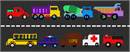 Two dump trucks, a fire engine, police car, ambulance, pickup truck, mail truck, cement mixer, and a school bus are all riding along the highway. Perfect for a classroom decor or a boys room.