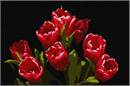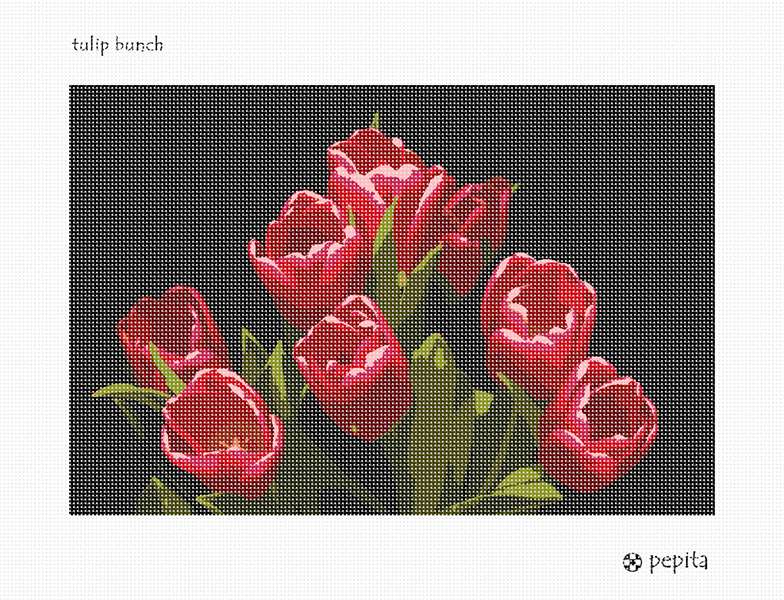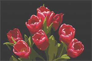 A bouquet of breathtaking fresh tulips. Real live tulips bloom once a year. Tulip needlepoints can be enjoyed throughout the year. Red tulips are most strongly associated with true love, while purple symbolizes royalty. The meaning of yellow tulips has evolved somewhat, from once representing hopeless love to now being a common expression for cheerful thoughts and sunshine.