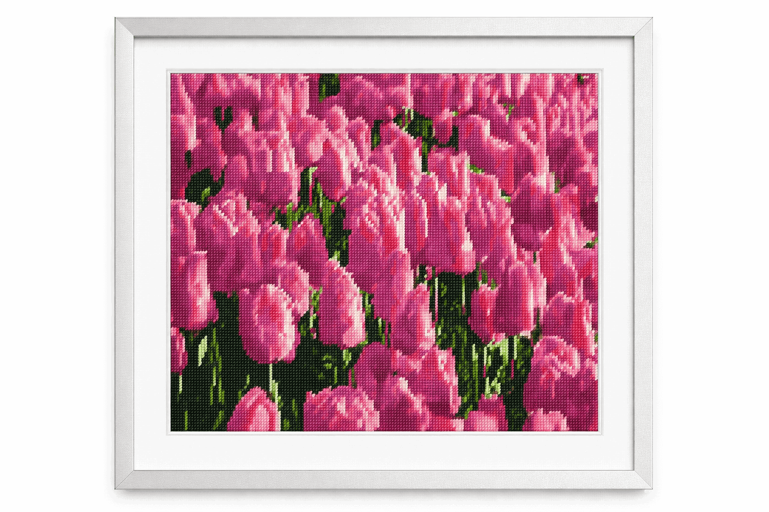 A bed of luscious tulips in fuchsias. Real live tulips bloom once a year. Tulip needlepoints can be enjoyed throughout the year. Red tulips are most strongly associated with true love, while purple symbolizes royalty. The meaning of yellow tulips has evolved somewhat, from once representing hopeless love to now being a common expression for cheerful thoughts and sunshine.