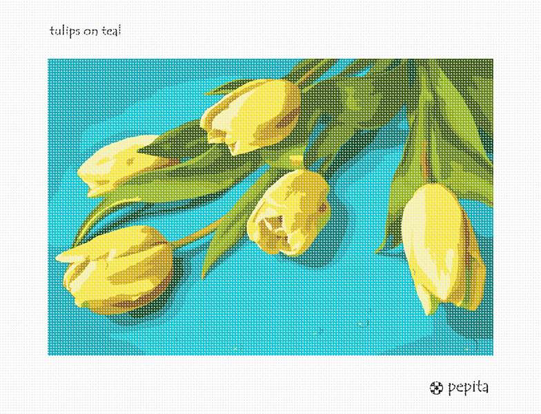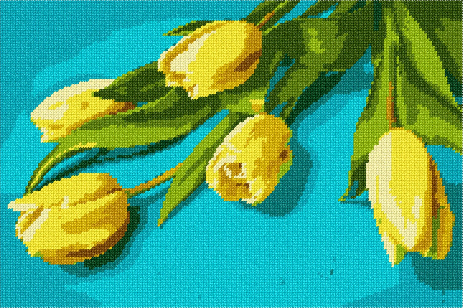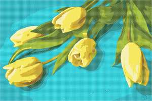 Bright and fresh, these tulips are ready for spring.Real live tulips bloom once a year. Tulip needlepoints can be enjoyed throughout the year. Red tulips are most strongly associated with true love, while purple symbolizes royalty. The meaning of yellow tulips has evolved somewhat, from once representing hopeless love to now being a common expression for cheerful thoughts and sunshine.