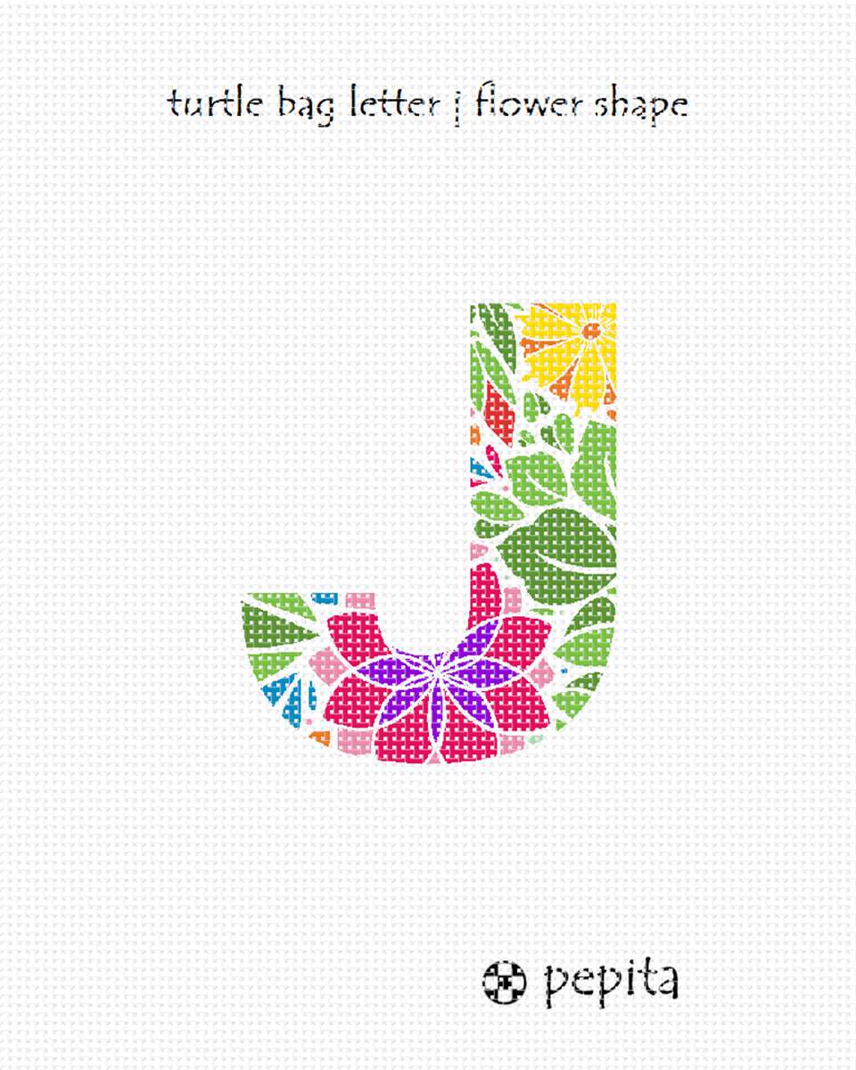 Turtle bags are all the rage! This lovely alphabet series is available in two sizes, and this 5 X 7 size fits as a needlepoint turtlebag insert. This lively J is all about flowers! Around 100 languages use the same alphabet like in English which makes it one of the most widely used alphabets in the world. While some languages have a few more and others a few less, they all share the 23 core letters originally found in the Roman alphabet. The most commonly used letter is the letter E. The letter J was the most recent letter to be added to the alphabet, appearing in print as a distinct letter for the first time in 1633. A sentence which contains all 26 letters of the English alphabet is called a pangram. A famous pangram is: “The quick brown fox jumps over the lazy dog.” but there are even shorter ones such as: “Pack my box with five dozen liquor jugs.” Every letter of the alphabet has a wild, or at least interesting, story, often going back thousands of years. You can look it up on Wikipedia. This is available in any letter of the ABC.